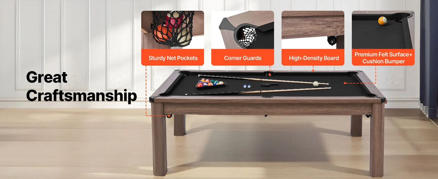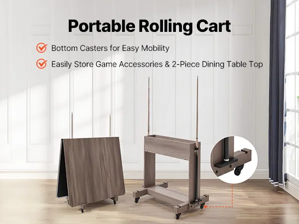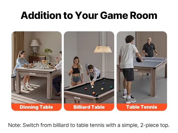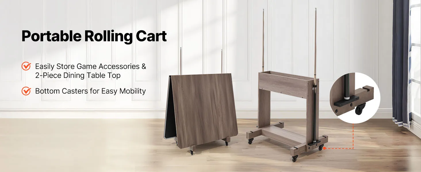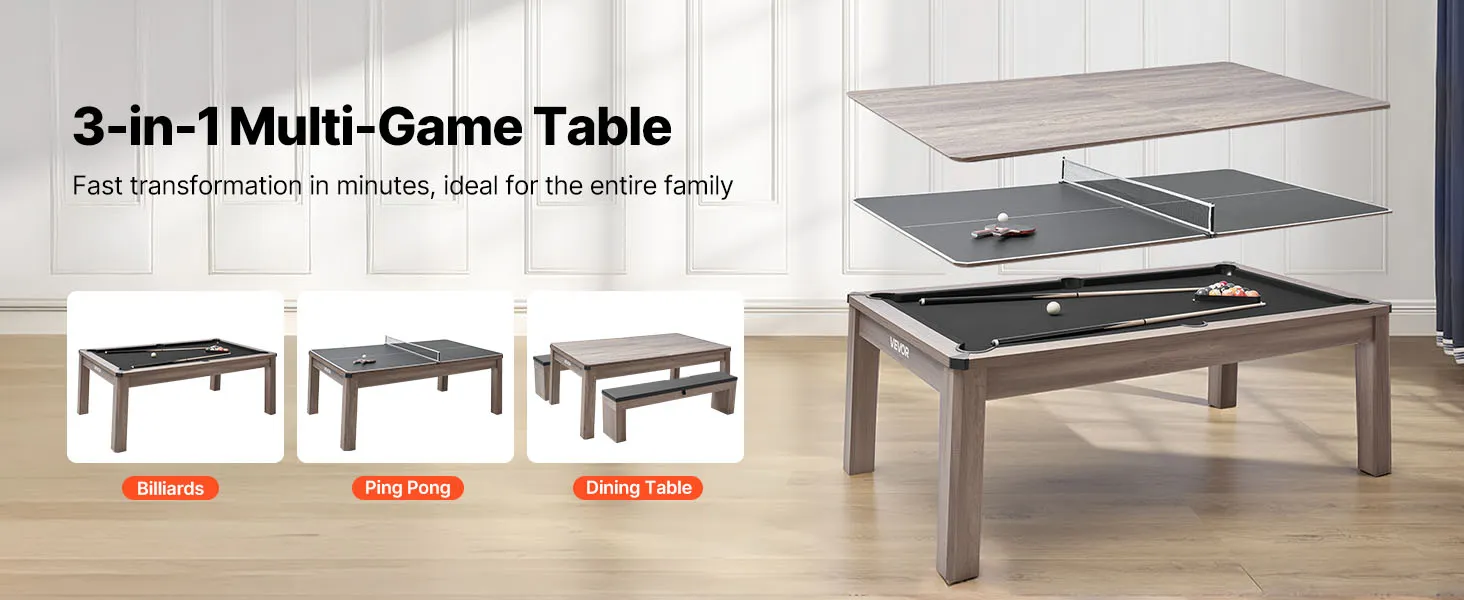 Stół do gry 3 w 1: Ten stół bilardowy łączy w sobie funkcje bilarda, stołu jadalnego i tenisa stołowego w jednym kompaktowym urządzeniu. Odwracalny blat stołu jadalnego może służyć również jako stół do tenisa stołowego lub można go wygodnie przechowywać na wózku, dzięki czemu można od razu grać.