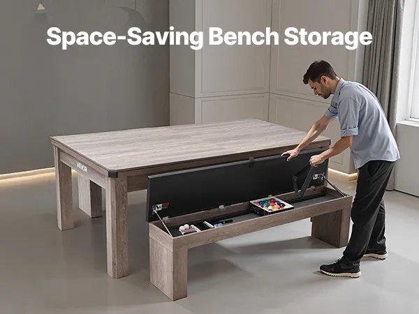 Ławki ze schowkiem w tym stole bilardowym łączą w sobie funkcje siedzenia i ukrytego miejsca do przechowywania, co maksymalizuje wydajność w małej przestrzeni.