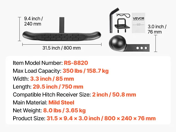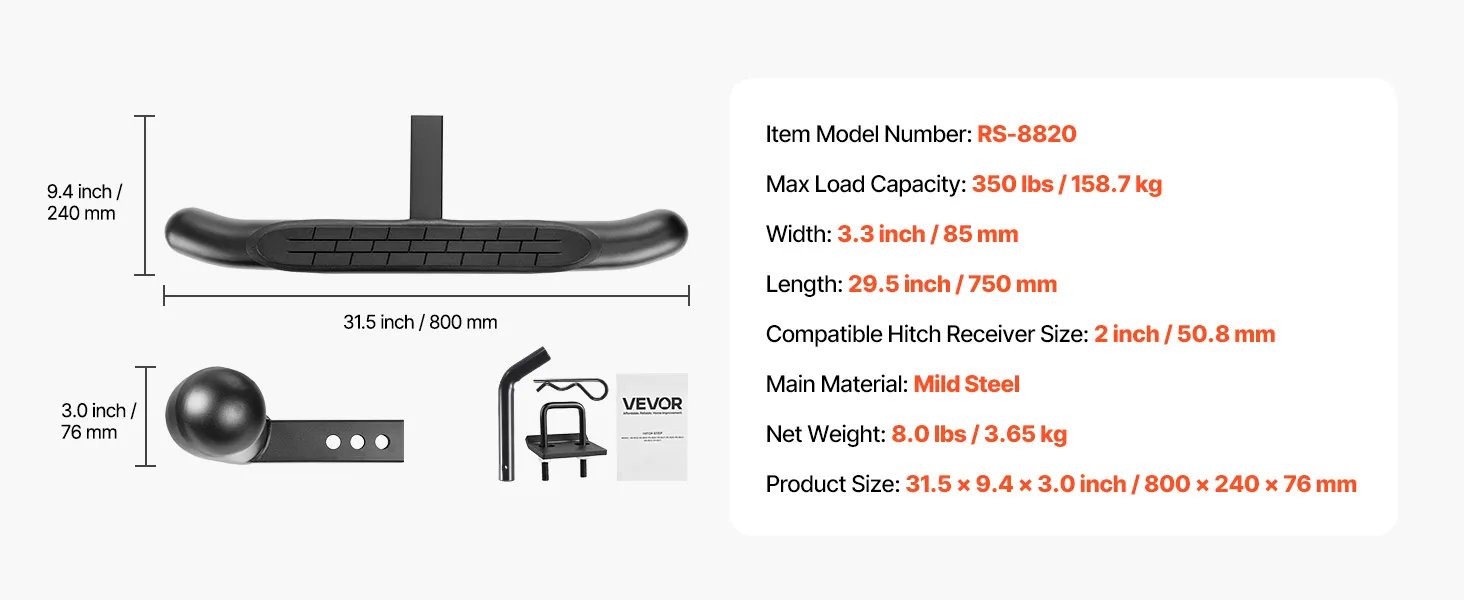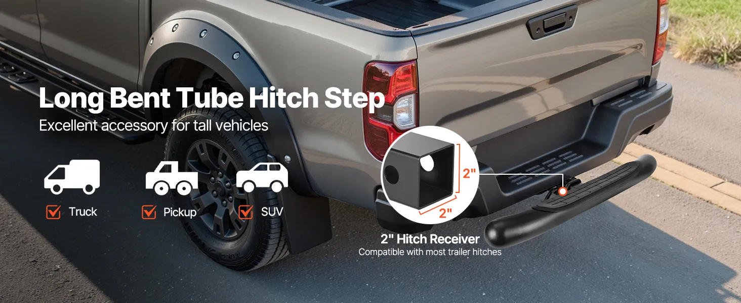 Stopień do haka holowniczego VEVOR do zaczepów 50,8 mm, uniwersalny ochraniacz tylnego zderzaka (nośność 158,7 kg), antypoślizgowy stopień do haka holowniczego z zestawem sworzni i stabilizatorem, do samochodów ciężarowych, SUV-ów i pickupów