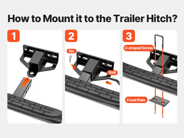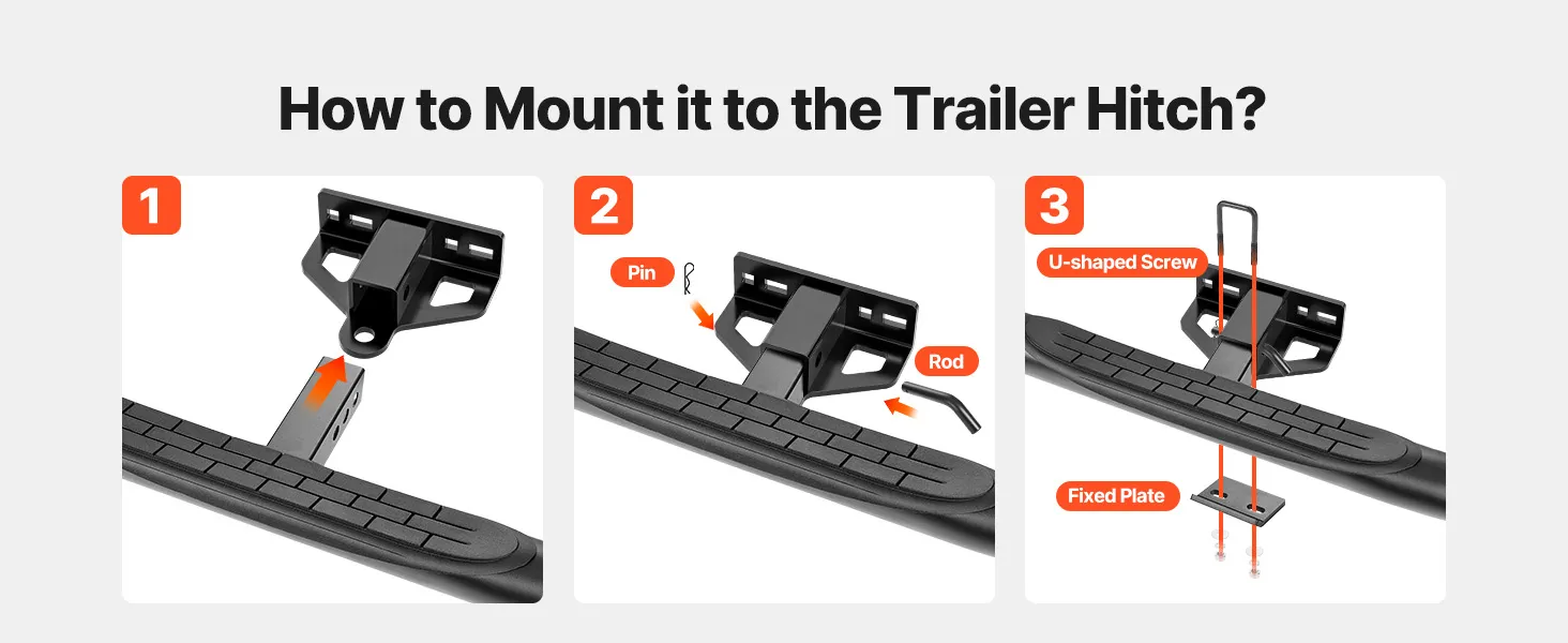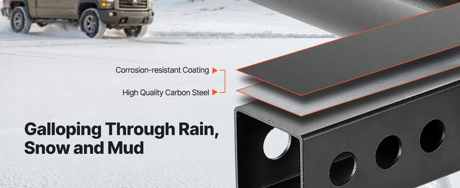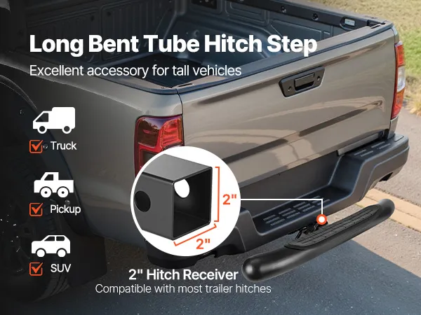 • Uniwersalne dopasowanie: Stopień haka holowniczego można zamontować w dowolnym pojeździe ze standardowym 2-calowym (50,8 mm) hakiem holowniczym, takim jak pickupy, SUV-y, vany i kampery.