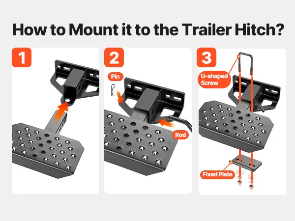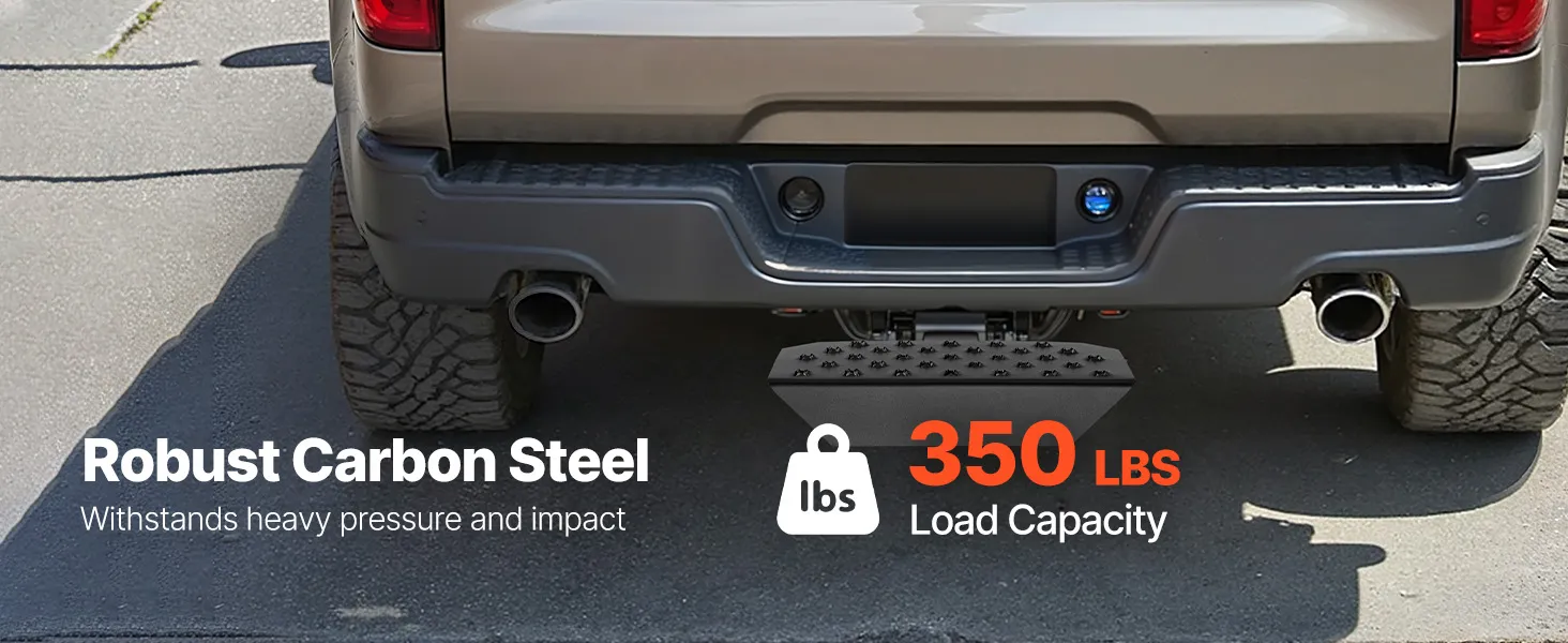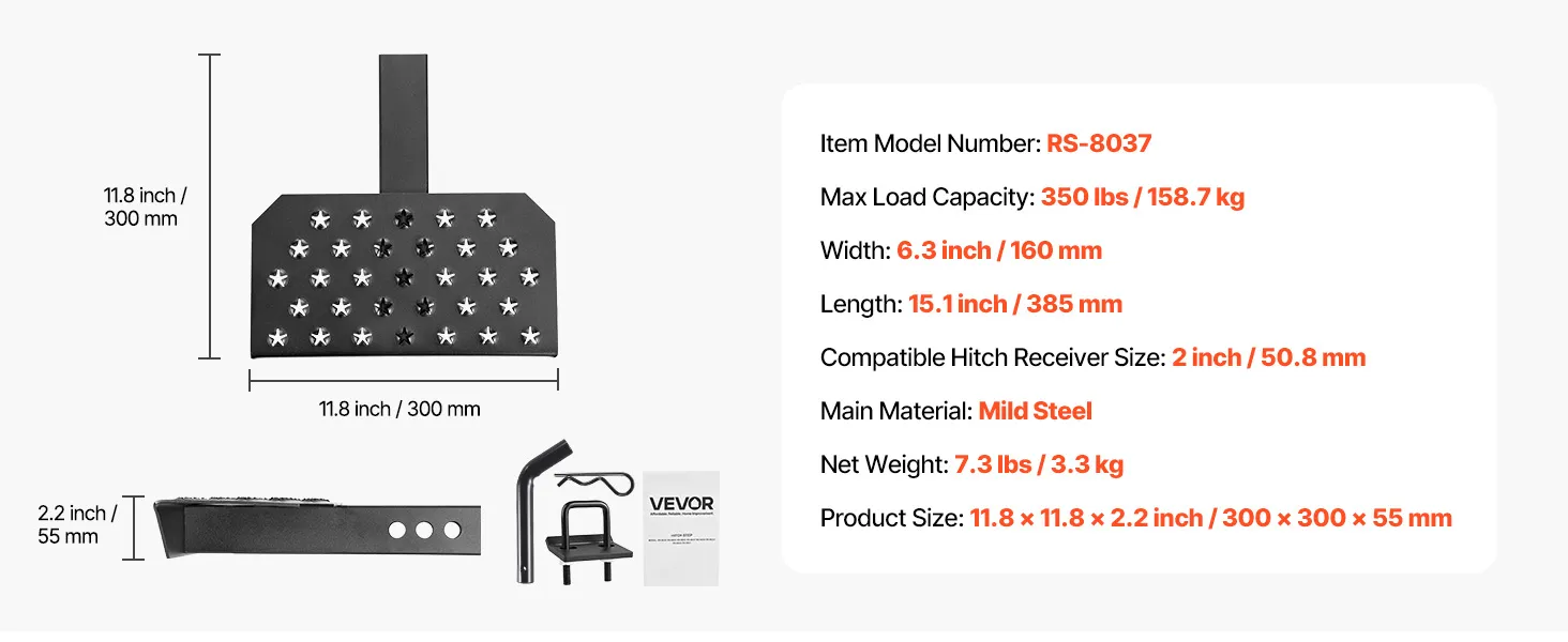 Stopień haka holowniczego VEVOR do odbiorników 50,8 mm, osłona tylnego zderzaka o nośności 158,7 kg, antypoślizgowy stopień haka holowniczego z zestawem sworzni i stabilizatorem, do samochodów ciężarowych, SUV-ów, pick-upów i przyczep