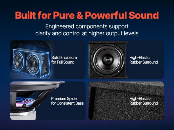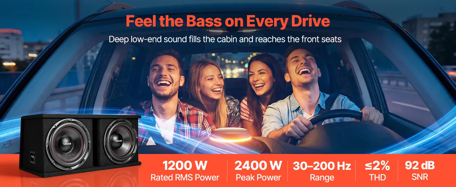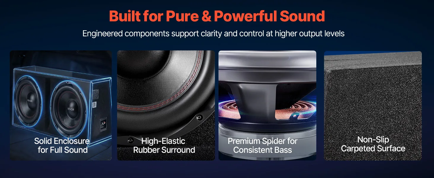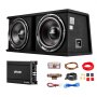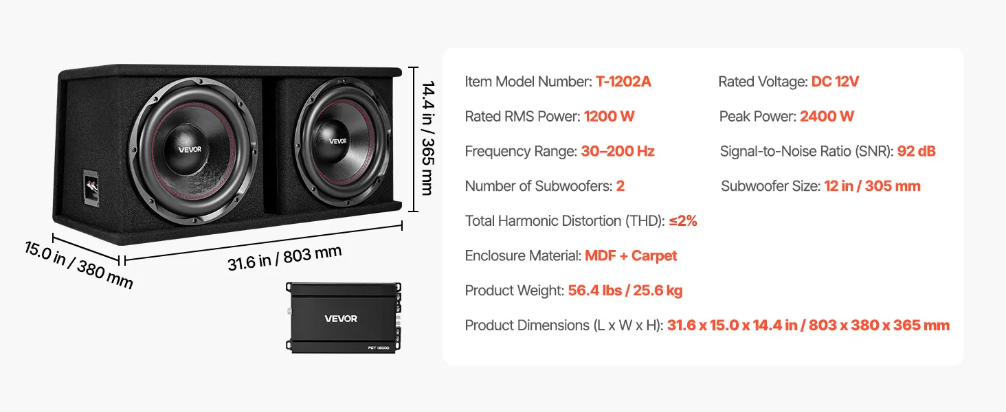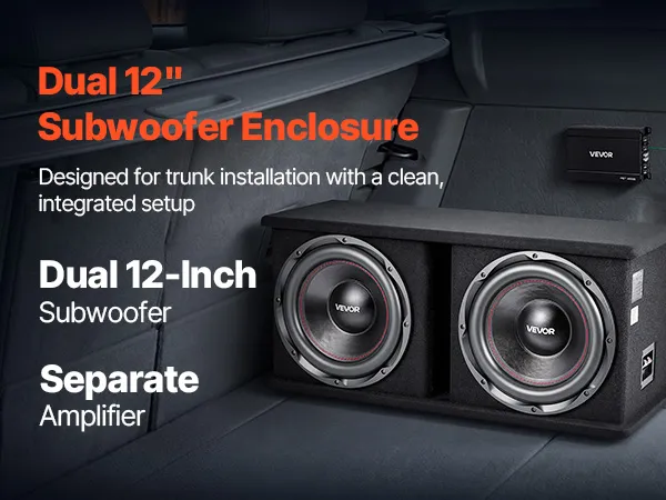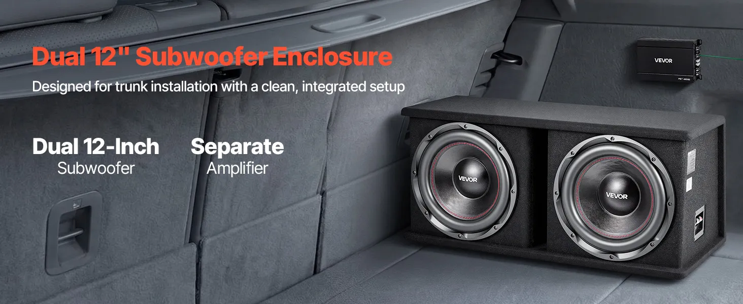 Zestaw subwoofera samochodowego VEVOR z obudową 305 mm, podwójny subwoofer i wzmacniacz o mocy 1200 W RMS, z oddzielnym wzmacniaczem i zestawem okablowania, wydajny system audio do samochodu