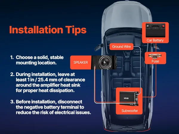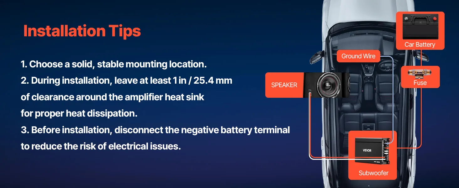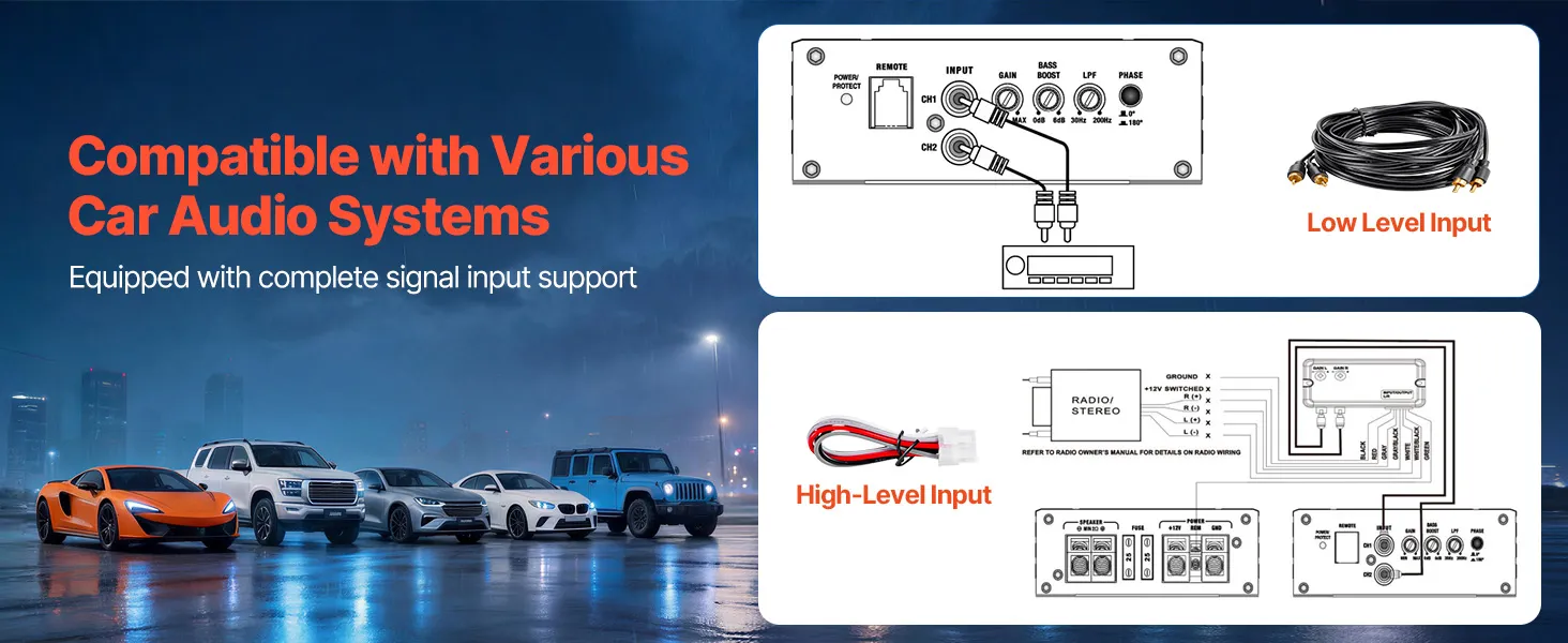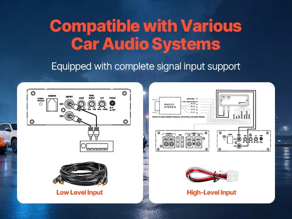 Wzmacniacz i subwoofer są kompatybilne z różnymi typami pojazdów, w tym sedanami, SUV-ami i pickupami. Szeroki zakres napięcia wejściowego i dołączony adapter wysokiego/niskiego poziomu obsługują zarówno radia samochodowe ze złączami RCA, jak i podstawowe radia fabryczne.