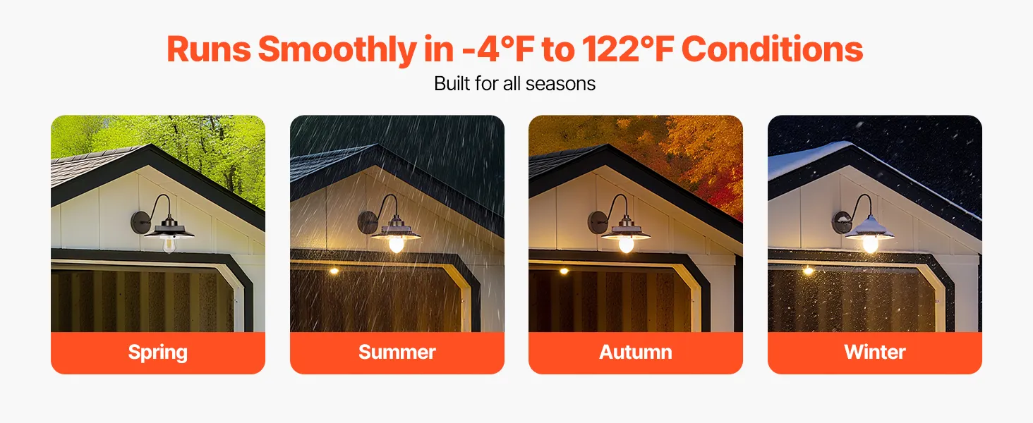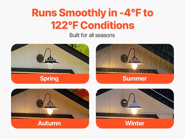 Niezawodne oświetlenie w każdych warunkach pogodowych: Ta lampa ogrodowa do stodoły działa niezawodnie w temperaturach od -20°C do 50°C. Z łatwością radzi sobie ze zmianami pór roku i zapewnia stabilne oświetlenie zewnętrzne zarówno w chłodne zimy, jak i upalne lata, nie wymagając konserwacji.