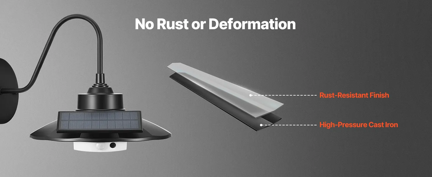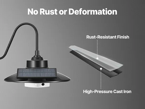 Ta solarna lampa stodołowa automatycznie wykrywa światło i ruch oraz steruje włączaniem i wyłączaniem, zmniejszając zużycie energii. Dzięki akumulatorowi o pojemności 2550 mAh i jasności 350 lumenów działa nawet podczas przerw w dostawie prądu. Wykonana z żeliwa wysokociśnieniowego z powłoką odporną na rdzę i wodę, idealnie nadaje się na tarasy, werandy i garaże.