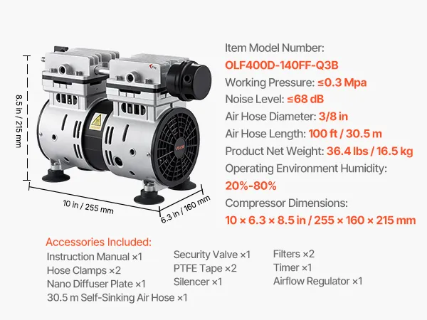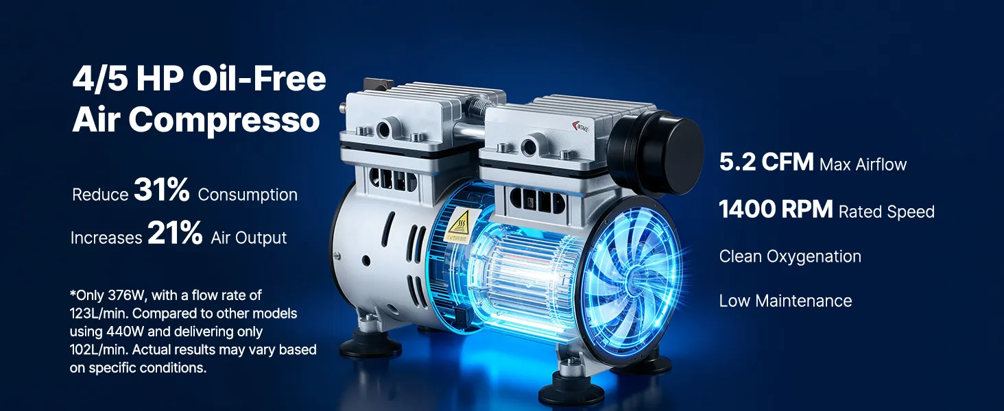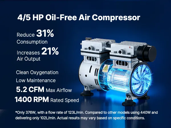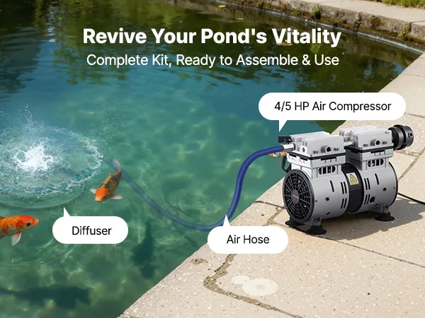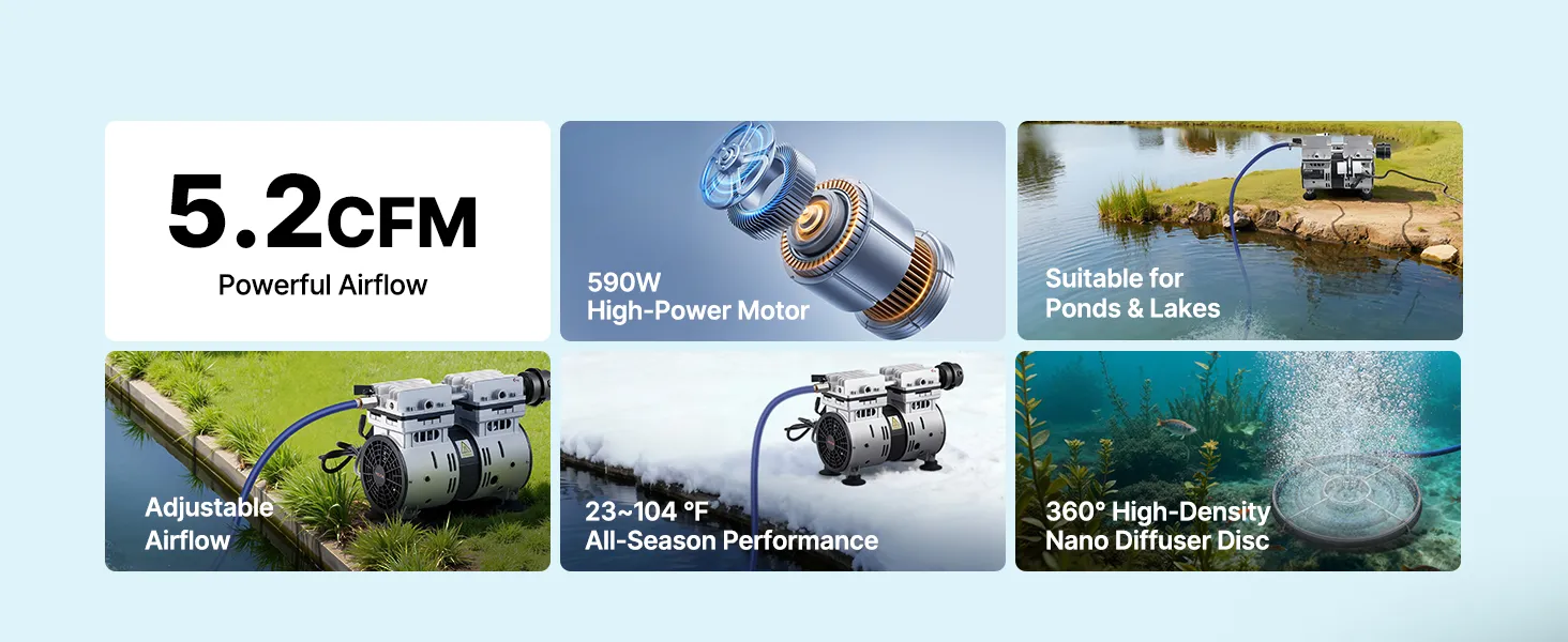 Mocny silnik 590 W: Ten napowietrzacz do oczka wodnego wyposażony jest w bezolejową sprężarkę powietrza o mocy 4/5 KM, która zapewnia przepływ do 5,2 CFM przy 1400 obr./min. Nasz napowietrzacz do oczka wodnego jest energooszczędny i wymaga minimalnej konserwacji.