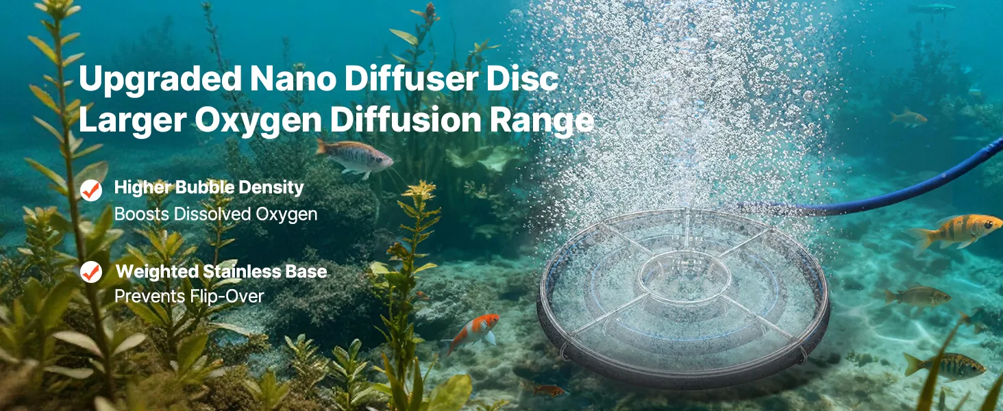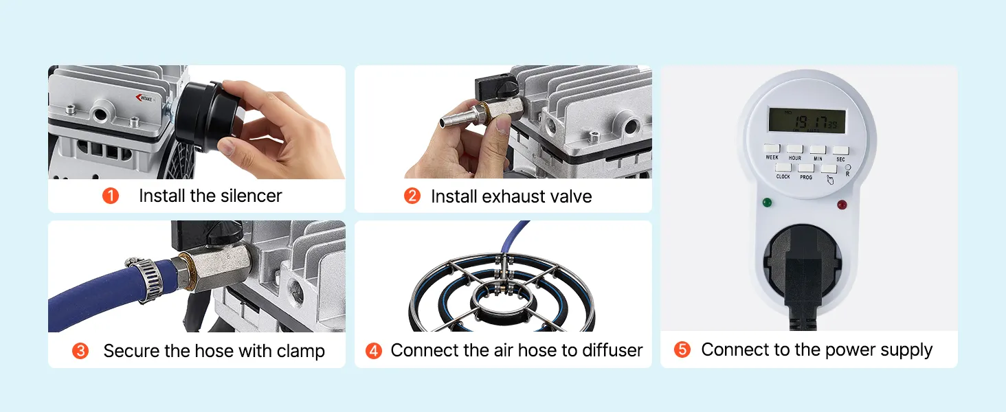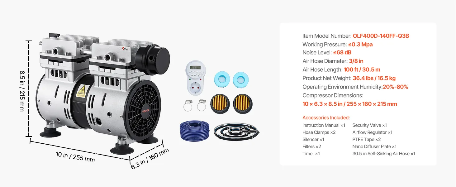 Kompletny zestaw: Aerator do oczka wodnego zewnętrznego dostarczany jest ze sprężarką powietrza, 30-metrowym samozatapialnym wężem z obciążnikiem, płytą dyfuzyjną, timerem i wszystkimi niezbędnymi akcesoriami.