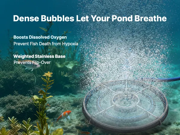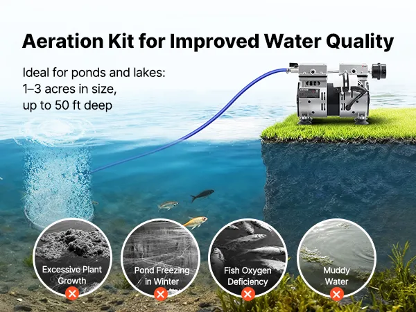 Ten gotowy do użycia zestaw do napowietrzania stawów jest odpowiedni do stawów o powierzchni do 1–3 hektarów i głębokości 15 metrów. Jest szybki w montażu i zwiększa poziom tlenu, poprawia jakość wody i ogranicza wzrost glonów.