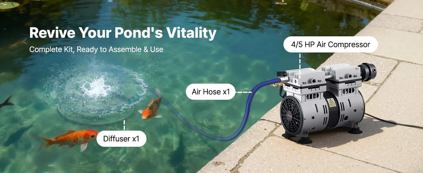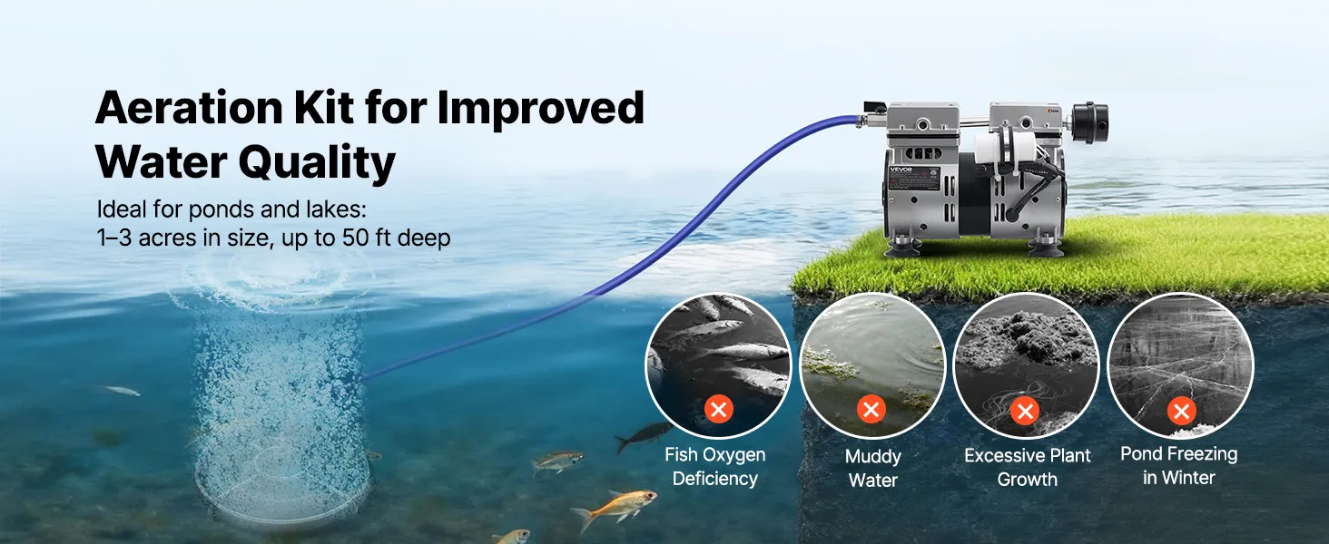 VEVOR Aerator do oczka wodnego, zestaw pomp do napowietrzania oczka wodnego, system napowietrzania oczka wodnego o mocy 590 W, 1400 obr./min, sprężarka powietrza do cyrkulacji tlenu z płytą dyfuzyjną Nano 360°, do oczka wodnego i ogrodu wodnego