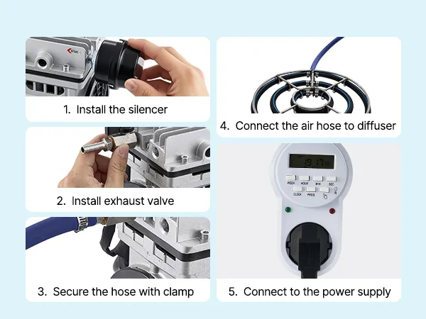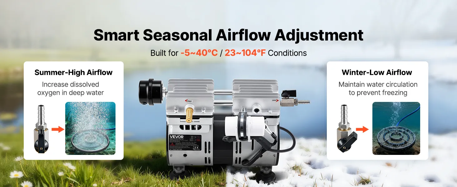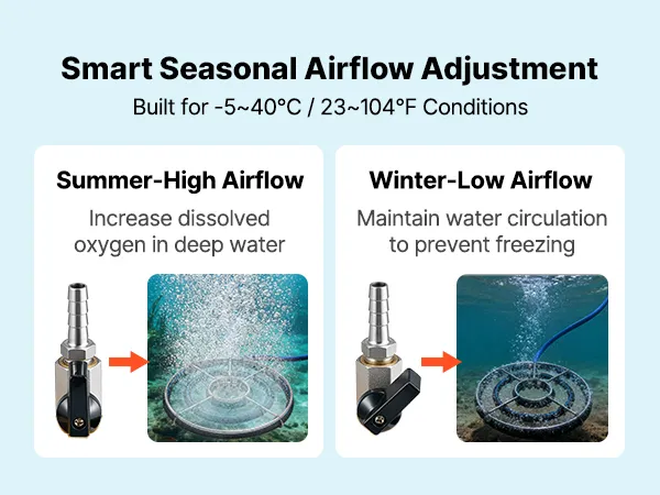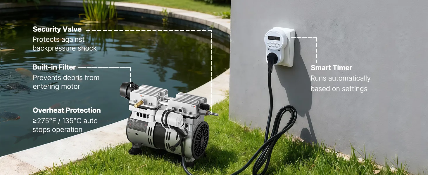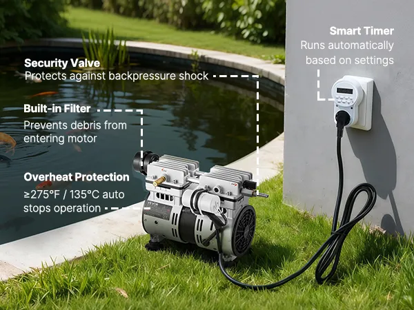 Liczne funkcje bezpieczeństwa: Aerator do oczka wodnego posiada zabezpieczenie przed przegrzaniem i zawór zwrotny, co zapewnia długotrwałą pracę. Umieść sprężarkę w dobrze wentylowanym i osłoniętym miejscu, aby chronić ją przed deszczem i bezpośrednim działaniem promieni słonecznych. Pozwoli to ograniczyć gromadzenie się kurzu i wydłużyć jej żywotność.