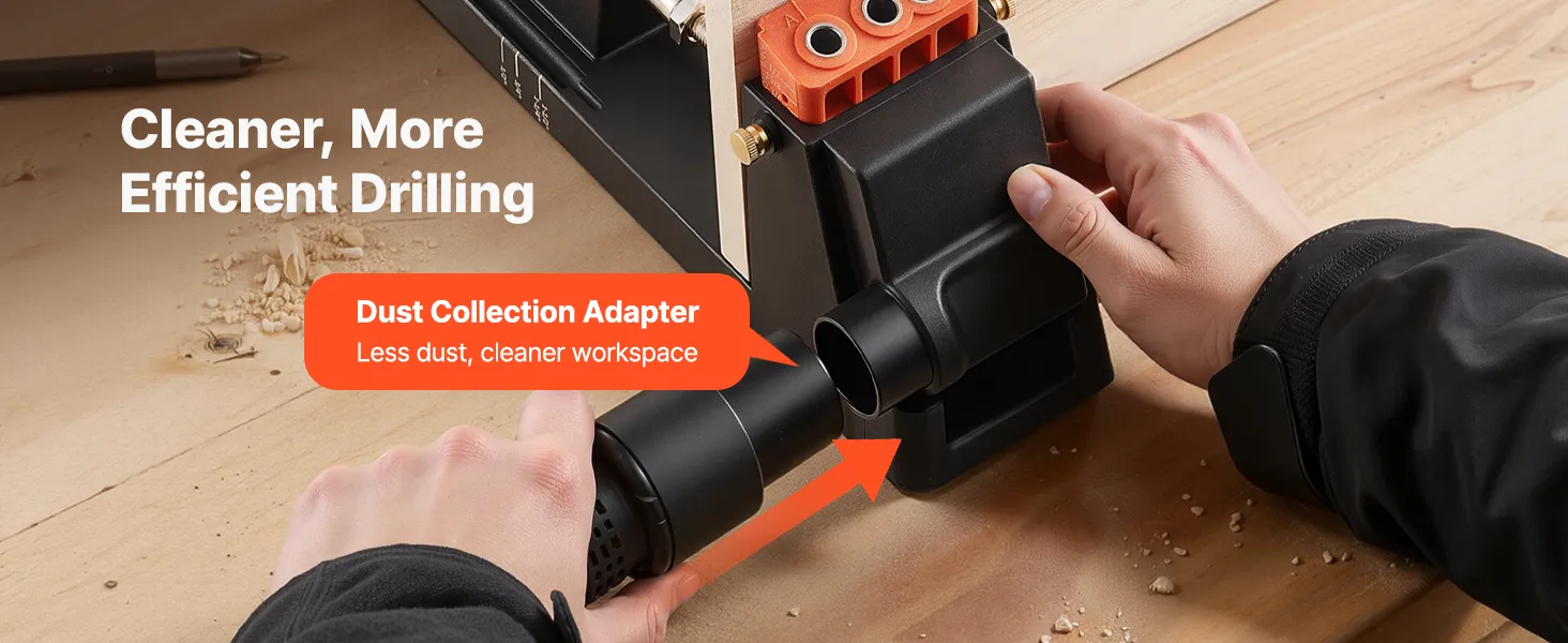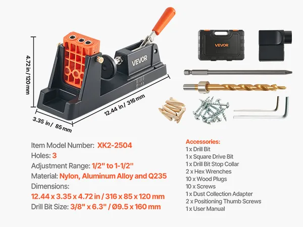 Czyste wiercenie: wyloty wiórów i odciąg pyłu usuwają wióry, redukując zatory podczas wielokrotnego użytku. Lekka obudowa z nylonu, wzmocniona stopem aluminium i stalą Q235, sprawia, że szablon do otworów kieszeniowych jest poręczny i wytrzymały.