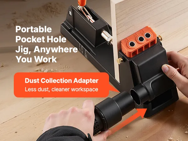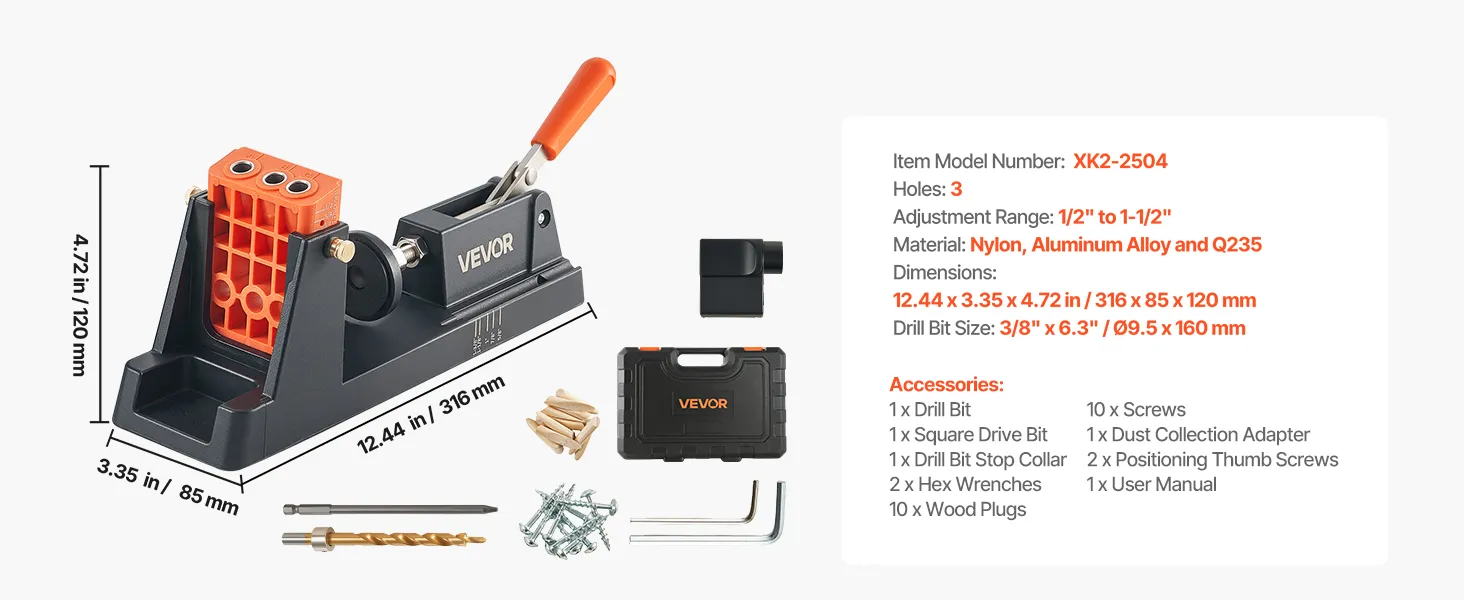 Szablon do otworów kieszeniowych VEVOR, 12,7 do 38,1 mm, kątowy pozycjoner otworów, zestaw szablonów do wiercenia otworów kieszeniowych z adapterem do odsysania pyłu, wyjmowany blok prowadzący, wiertło, pierścień oporowy, do obróbki drewna