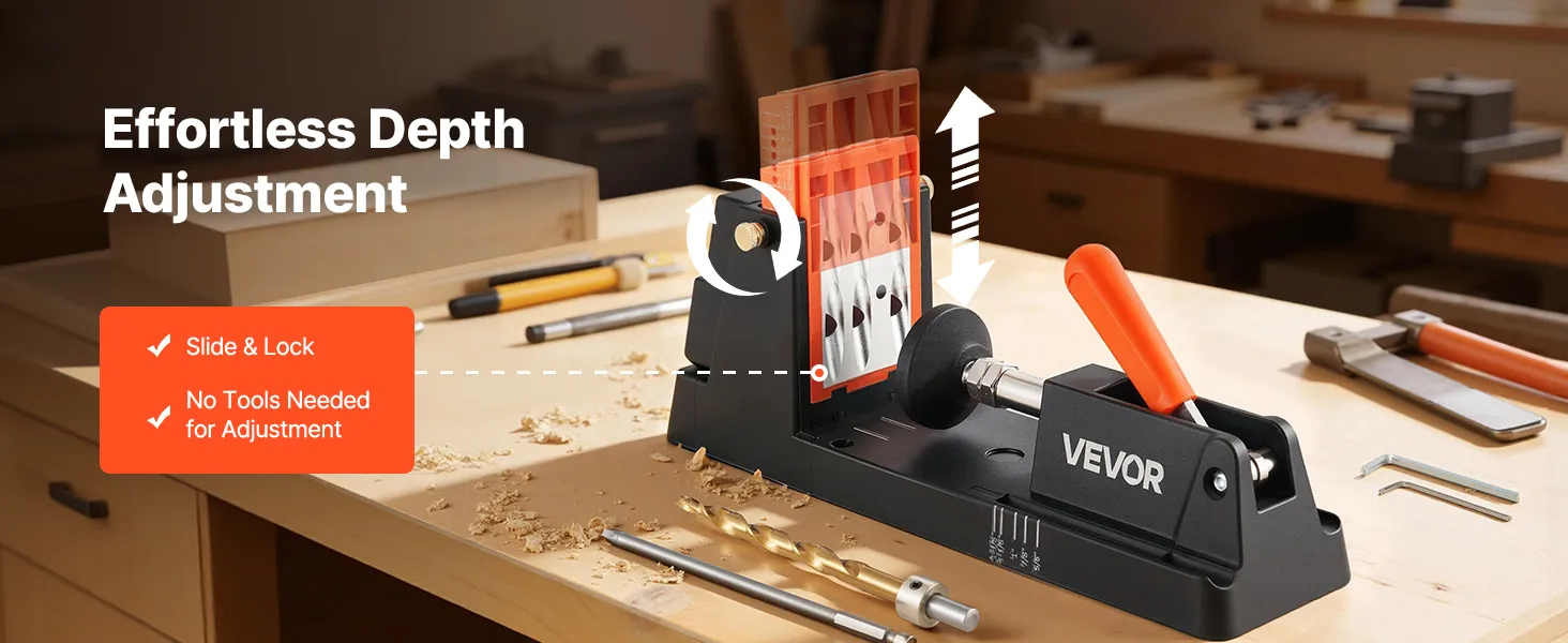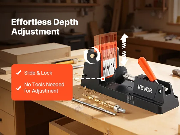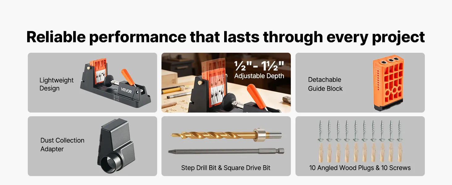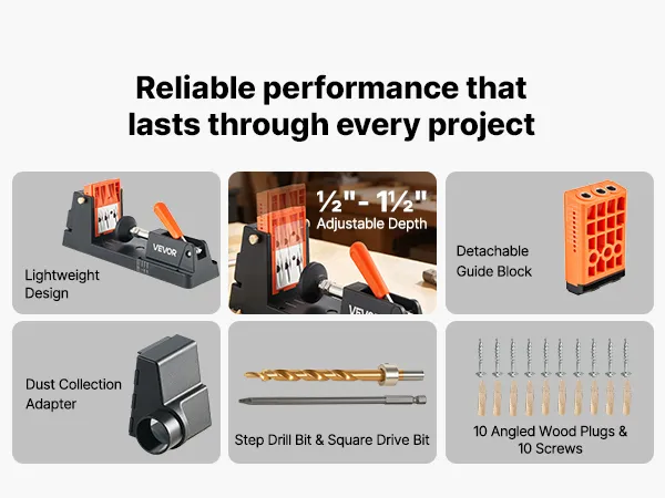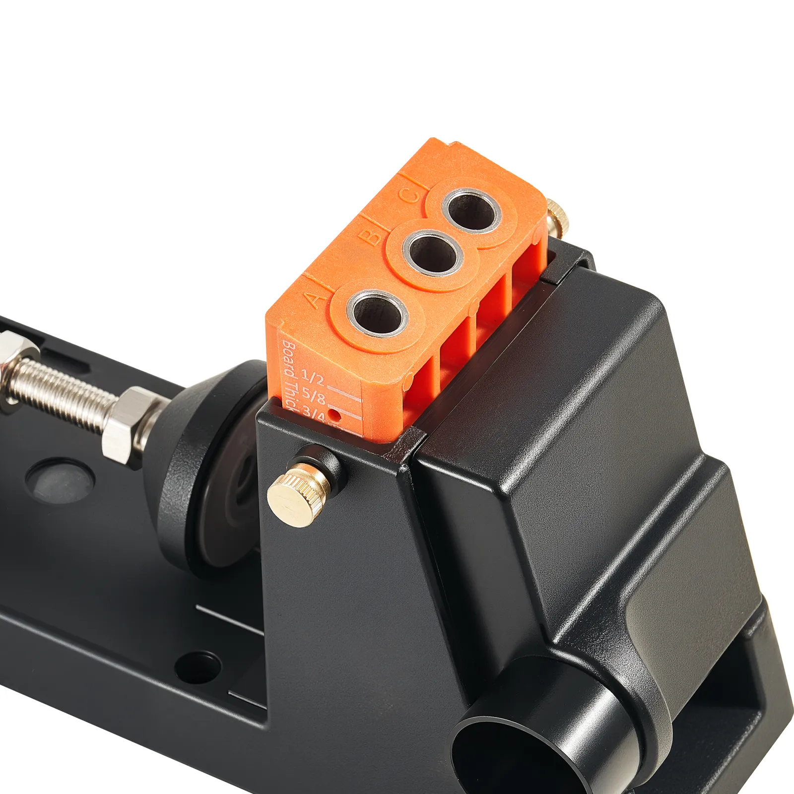Łatwa regulacja głębokości: dzięki zakresowi regulacji od 12,7 mm do 38,1 mm (od ½ do 1½ cala) i wyraźnym oznaczeniom nasz zestaw szablonów do wiercenia otworów kieszeniowych umożliwia regulację głębokości wiercenia w ciągu kilku sekund – wystarczy przesuwać zaznaczony regulator do przodu i do tyłu.