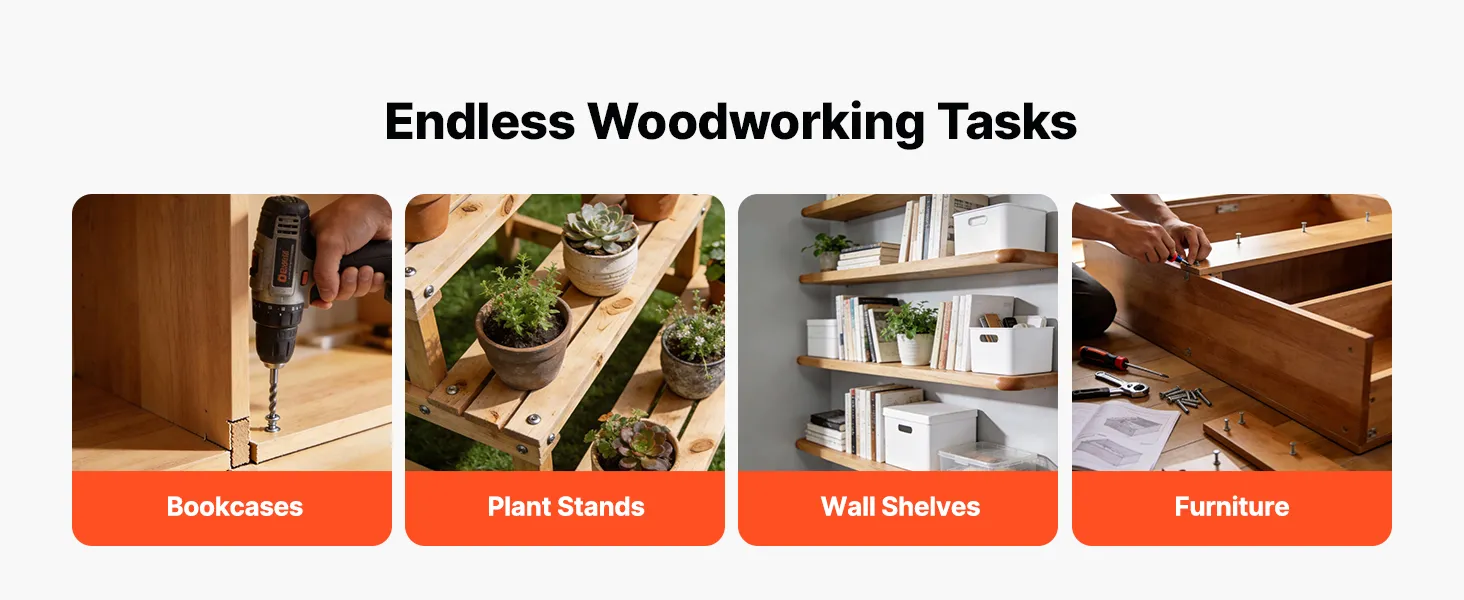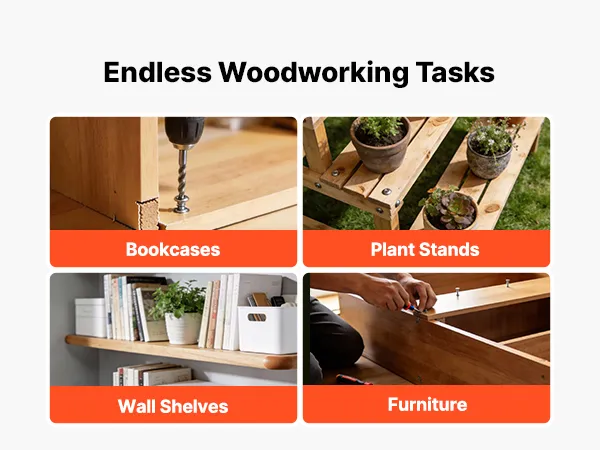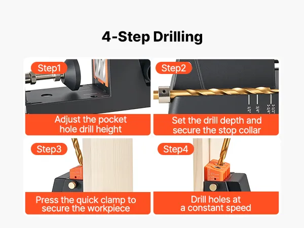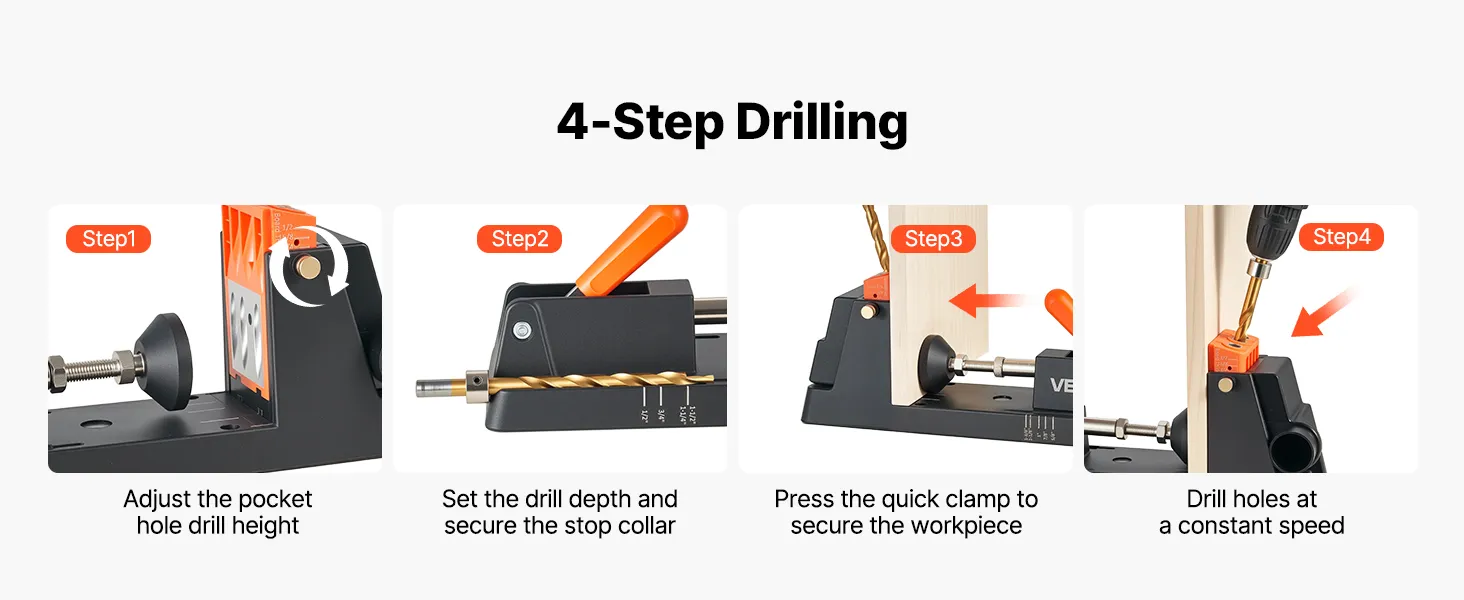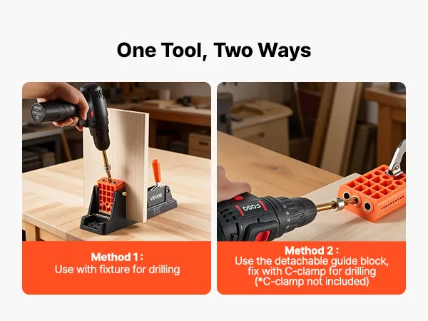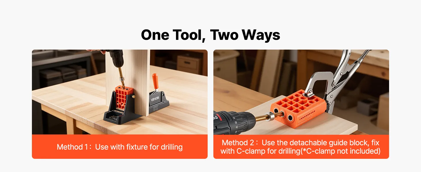 Wszechstronność 2 w 1 dla elastycznego zastosowania: Wierć bezpośrednio za pomocą zintegrowanego szablonu lub zdejmij klocek prowadzący, aby wiercić pod kątem. Ten system wiercenia otworów kieszeniowych nadaje się do długich i krótkich desek oraz do różnorodnych zadań – nie wymaga dodatkowych narzędzi, co zapewnia maksymalną elastyczność.