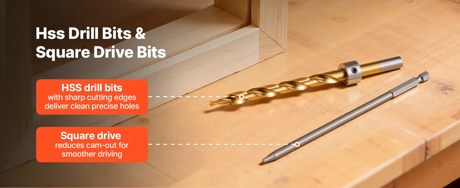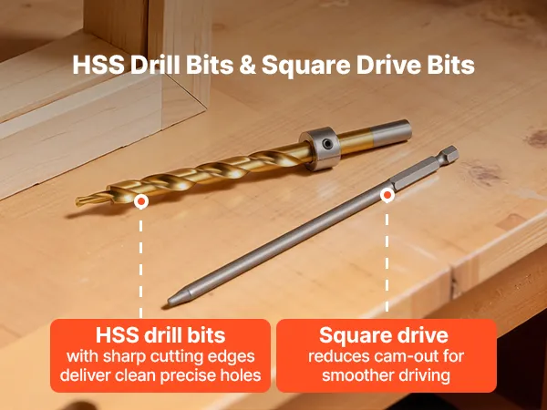 Czyste, gładkie otwory kieszeniowe: Zestaw do otworów kieszeniowych zawiera wiertło stopniowe z powłoką tytanową i pierścieniem oporowym, zapewniające gładkie i równe otwory kieszeniowe. Dołączony napęd kwadratowy zapewnia pewne mocowanie wkrętów i zmniejsza poślizg, co przekłada się na czystsze połączenia.