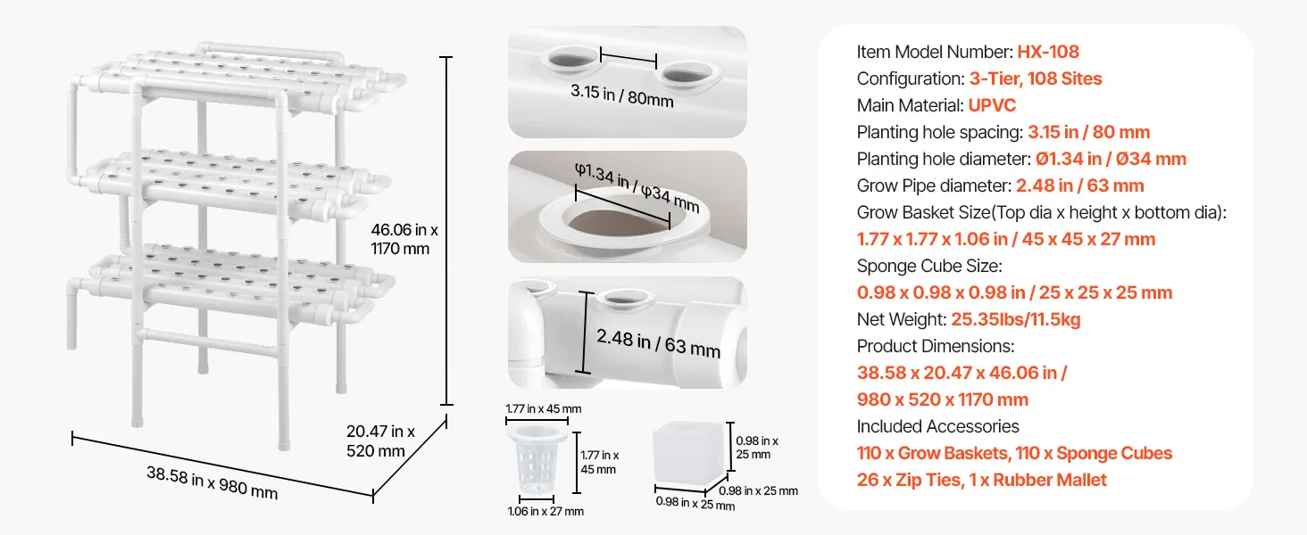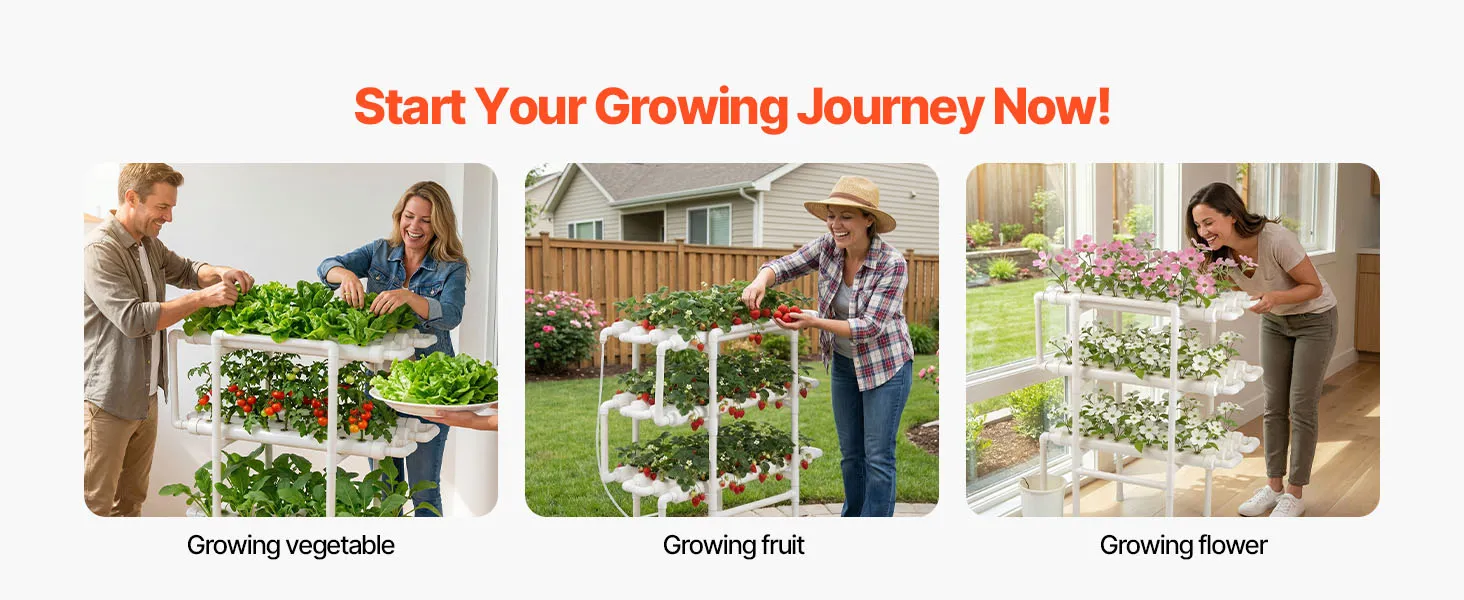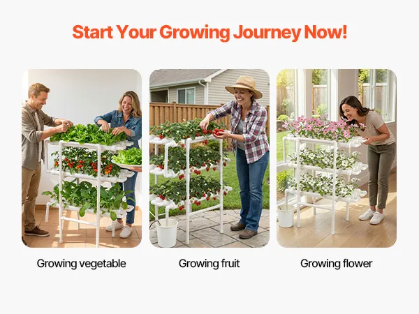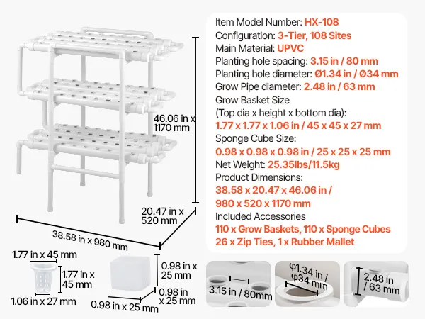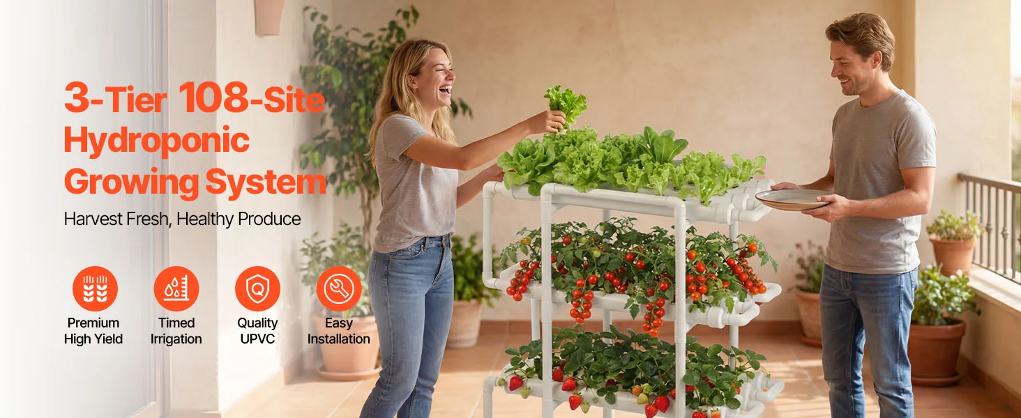Wysokie plony, najwyższa jakość: Trójpoziomowe tuby hydroponiczne ze 108 miejscami do sadzenia sprzyjają wzrostowi roślin. Maksymalnie wykorzystują przestrzeń w porównaniu z uprawą w gruncie. Czystsze, bardziej zrównoważone i idealne do uprawy sałaty, owoców i kwiatów w domu lub w szklarni.