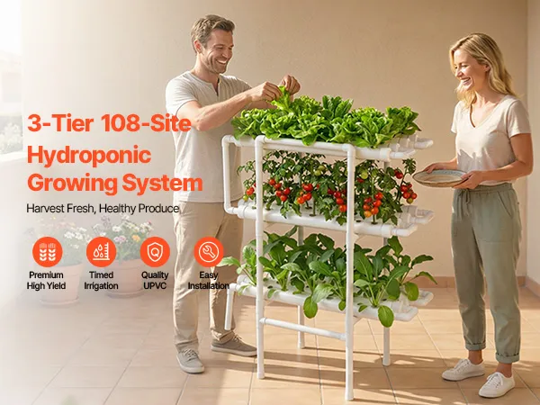 System hydroponiczny wykonany z tworzywa PVC charakteryzuje się 3-warstwową konstrukcją ze 108 miejscami do sadzenia i wykorzystuje obieg bogatej w składniki odżywcze wody, co sprzyja zdrowemu wzrostowi roślin, większym plonom oraz czystej uprawie bez gleby.