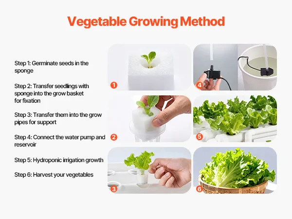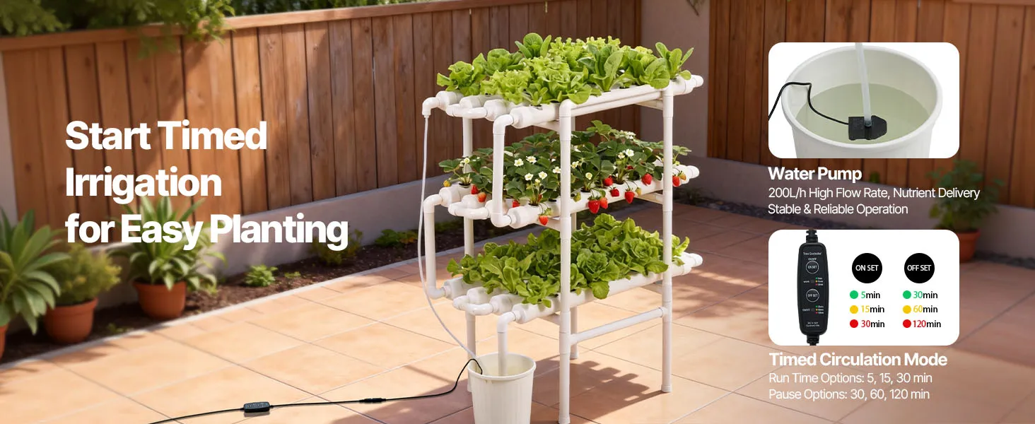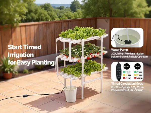 System nawadniania z regulacją czasową: Wyposażony w pompę wodną o mocy 4 W i timer zapewniający efektywną cyrkulację wody, umożliwiając roślinom lepsze wchłanianie składników odżywczych. Zestaw hydroponiczny zawiera 24-godzinny timer, który umożliwia ustawienie automatycznych cykli włączania/wyłączania.