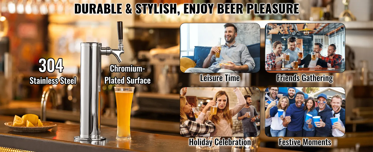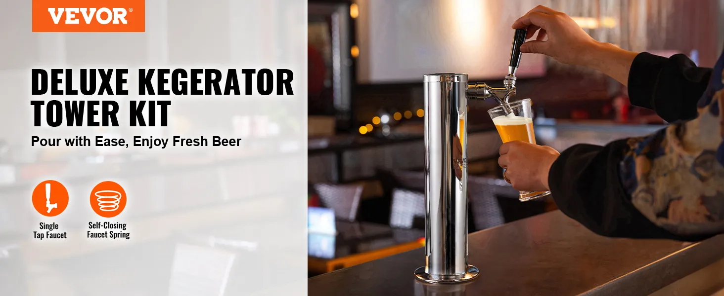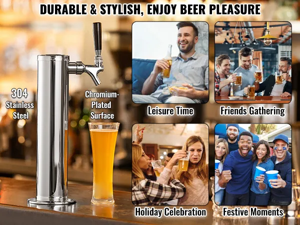 Zestaw wieży kegeratora VEVOR jest zbudowany tak, aby przetrwać. Chromowany, solidny kran do piwa z mosiądzu i rdzeń ze stali nierdzewnej 304 zapewniają trwałość. Materiały te są odporne na zużycie i rozdarcie, zachowując oryginalny smak napojów. Trwała konstrukcja sprawia, że nadaje się zarówno do użytku domowego, jak i komercyjnego. Ten dozownik został zaprojektowany tak, aby wytrzymać intensywne użytkowanie bez uszczerbku dla jakości. Konstrukcja odporna na rdzę zapewnia, że napoje pozostają czyste i nieskażone, dzięki czemu ten dozownik jest niezawodnym wyborem w każdym otoczeniu.