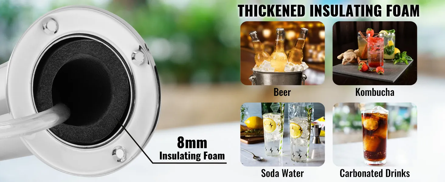 Pianka izolacyjna o grubości 8 mm zapewnia doskonałą izolację termiczną. Dzięki temu Twoje napoje pozostają świeże i chłodne, co poprawia ich smak. Nie ma znaczenia, czy serwujesz piwo, kombuchę czy wodę sodową; ten dozownik utrzymuje optymalną temperaturę. Jest to ważne na wydarzeniach takich jak wesela i imprezy. Za każdym razem, gdy go pijesz, odczuwasz orzeźwienie i przyjemność. Ulepszona izolacja zmniejsza również potrzebę częstego chłodzenia. Dlatego wieża piwna VEVOR na imprezy jest energooszczędna i opłacalna. Twoje napoje zawsze pozostają świeże. Nasza stała świeżość zapewnia, że Twoje napoje są zadowolone.