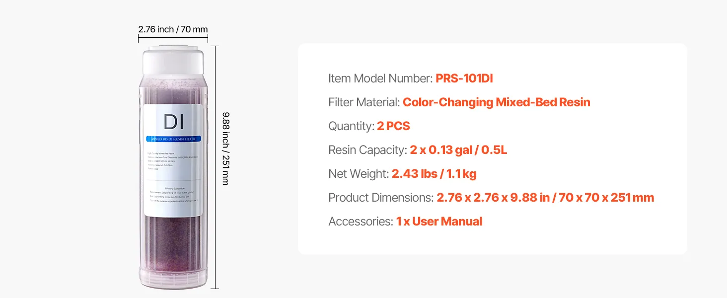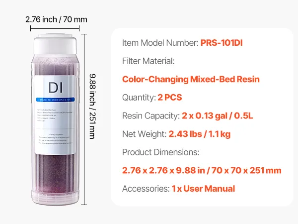 Ten zmieniający kolor filtr z żywicy DI jest przeznaczony do stosowania z systemem dejonizacyjnym VEVOR PRS-101XC. Skutecznie usuwa wapń, magnez i TDS, dostarczając zdejonizowaną wodę, dzięki czemu mycie samochodu przebiega bez zakłóceń.