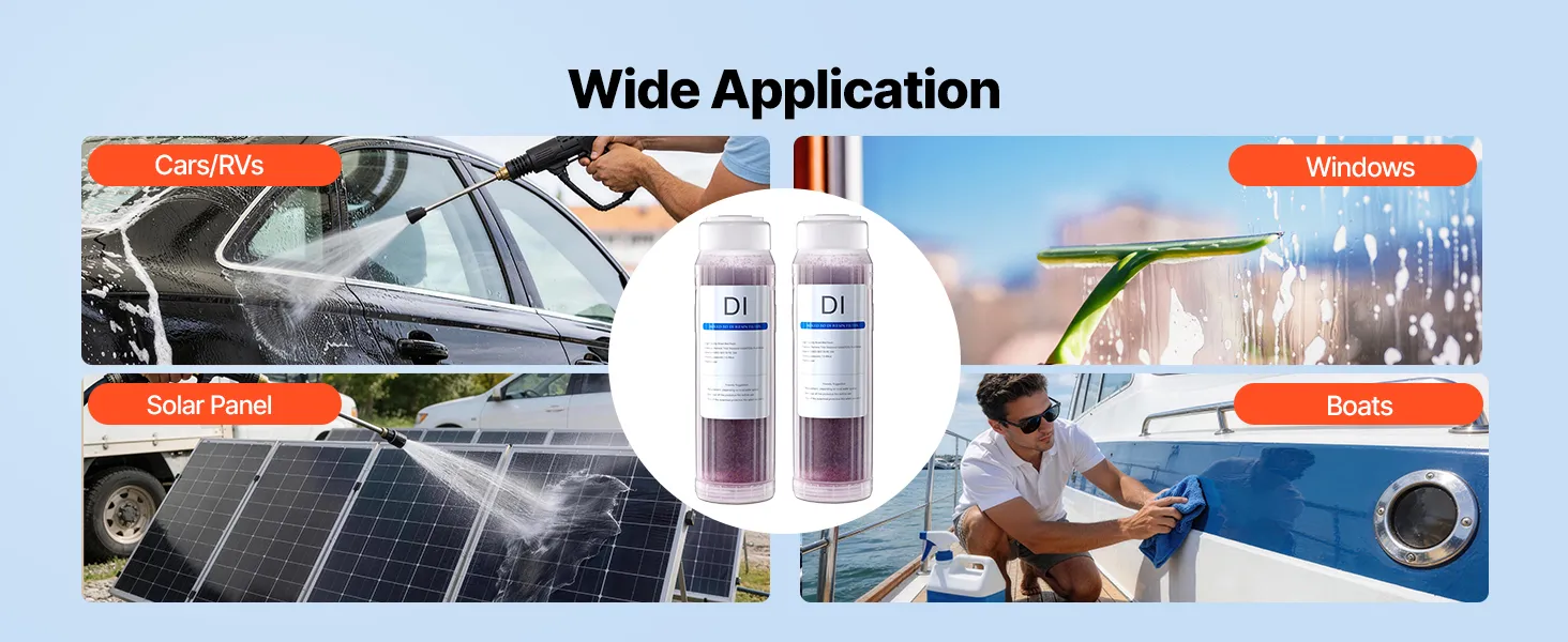 • Szeroki zakres zastosowań: Ten dejonizowany filtr do mycia samochodów w czystości idealnie nadaje się do mycia samochodów, kamperów, motocykli, łodzi, a także okien i paneli słonecznych.