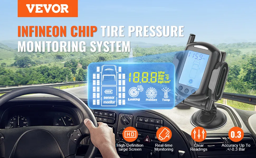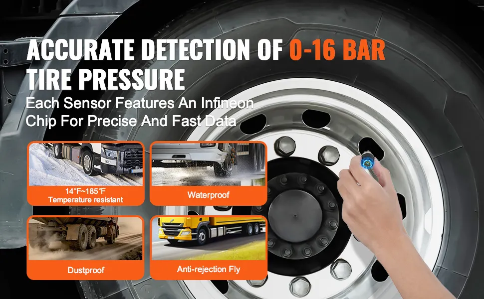 Czujnik z chipem Infineon: Każdy czujnik w zewnętrznej obudowie jest wyposażony w chip Infineon, co poprawia dokładność danych i szybkość reakcji. Nasz system TPMS do przyczep precyzyjnie mierzy ciśnienie w oponach w zakresie od 0 do 199 psi (0-16 barów), z dokładnością danych do +/-0,3 bara.