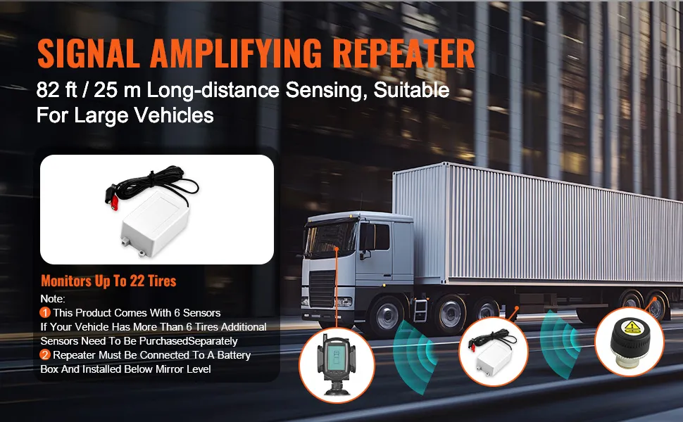 Monitorowanie ciśnienia w oponach pojazdów wieloosiowych: Nasz system monitorowania ciśnienia w oponach pojazdów kempingowych może monitorować do 22 opon w czasie rzeczywistym. Posiada wzmacniacz sygnału o zasięgu 25 m (82 stóp) i wzmacnia sygnał, co czyni go idealnym rozwiązaniem dla dużych pojazdów, takich jak przyczepy i ciężarówki. Uwaga: Produkt jest dostarczany z 6 czujnikami. Jeśli pojazd ma więcej niż 6 opon, dodatkowe czujniki należy zakupić osobno.
