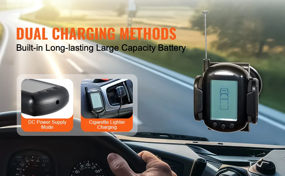 Ładowanie prądem stałym + przez gniazdo zapalniczki: Uniwersalny bezprzewodowy system alarmowy do samochodu jest wyposażony w akumulator o dużej pojemności i może być zasilany prądem stałym lub przez gniazdo zapalniczki. Ta opcja podwójnego ładowania wydłuża żywotność akumulatora i zmniejsza potrzebę częstego ładowania.