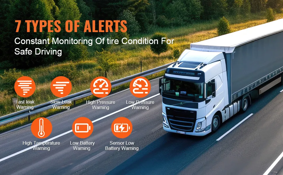 System ostrzegawczy: Wyposażony w 7 rodzajów ostrzeżeń o nieprawidłowym ciśnieniu w oponach, w tym ostrzeżenie o szybkim wycieku, ostrzeżenie o niskim/wysokim ciśnieniu, ostrzeżenie o wysokiej temperaturze i inne. Ten wodoodporny zestaw czujników TPMS natychmiast powiadamia o stanie opon, aby uniknąć potencjalnych zagrożeń.