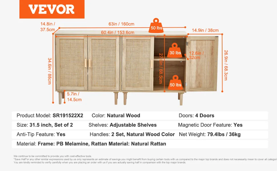 Nasza szafka bufetowa została zaprojektowana tak, aby wytrzymać duże obciążenia. Górna półka wytrzymuje ciężar do 22,7 kg, wewnętrzne półki 13,6 kg, a dolna półka 22,7 kg.