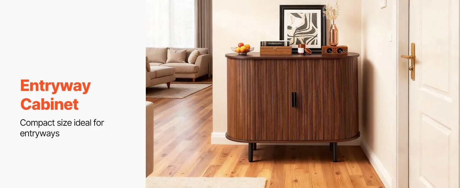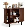 Unikalna konstrukcja drzwi przesuwnych: Ta szafka barowa z pionowymi drzwiami przesuwnymi z drewnianym wykończeniem i elegancką, zaokrągloną sylwetką doda Twojemu domowi odrobinę wyrafinowania. Naturalna drewniana powierzchnia i metalowe uchwyty łączą w sobie elementy nowoczesne i średniowieczne, czyniąc ją praktycznym rozwiązaniem do przechowywania.
