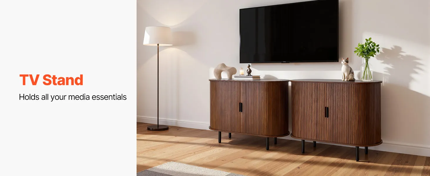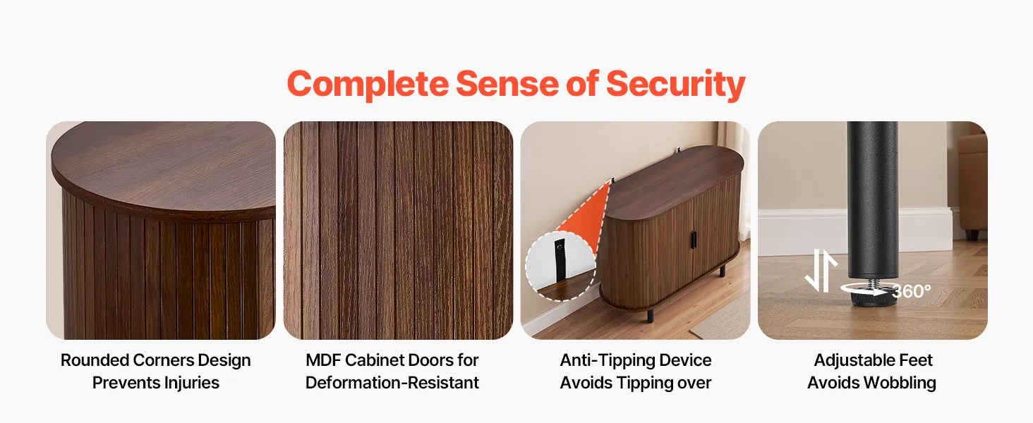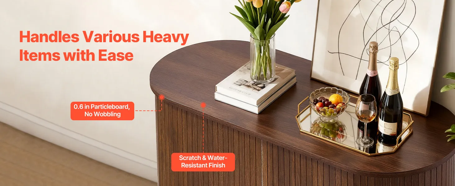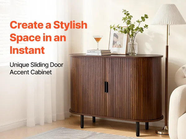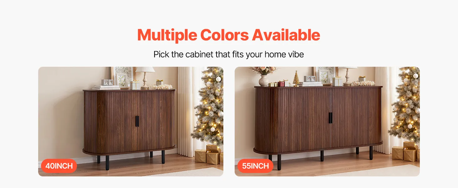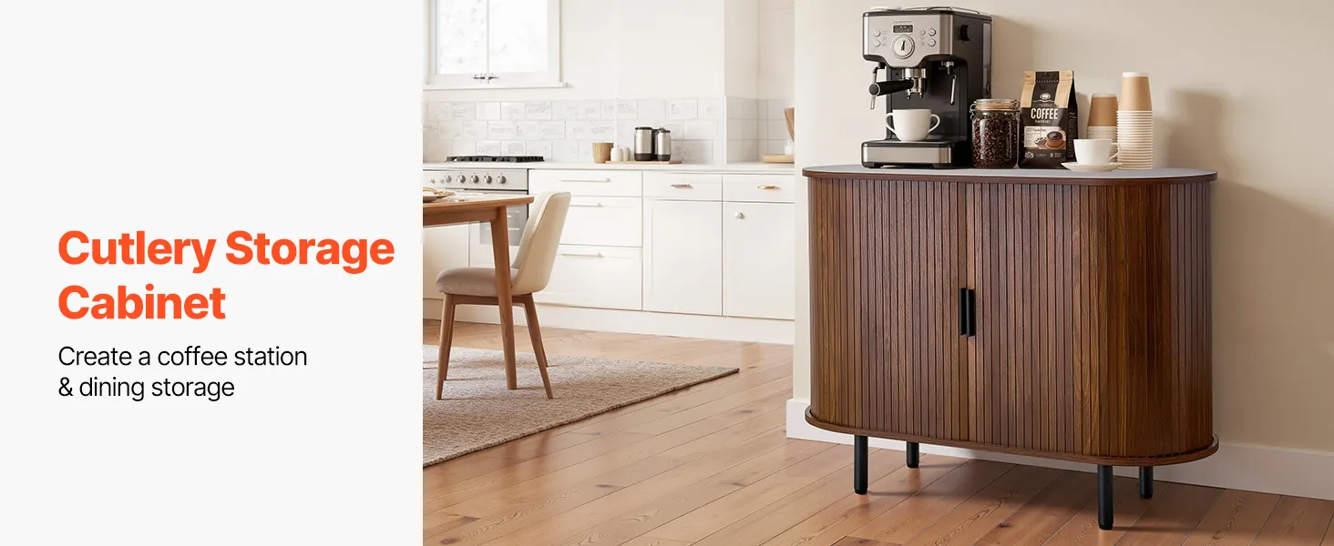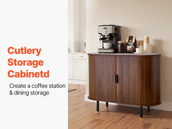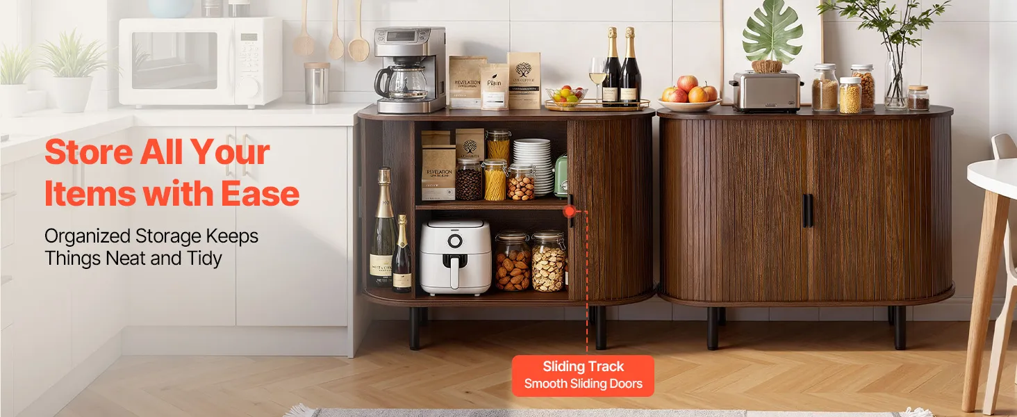 Wszechstronne miejsce do przechowywania: Komoda z przesuwanymi drzwiami oferuje ukryte schowki i regulowane, wyjmowane półki z trzema ustawieniami wysokości, co zapewnia maksymalną przestrzeń do przechowywania. Przestronny blat pomieści ekspres do kawy, toster lub przedmioty dekoracyjne – wszystko w zasięgu ręki i atrakcyjnie wyeksponowane.