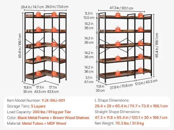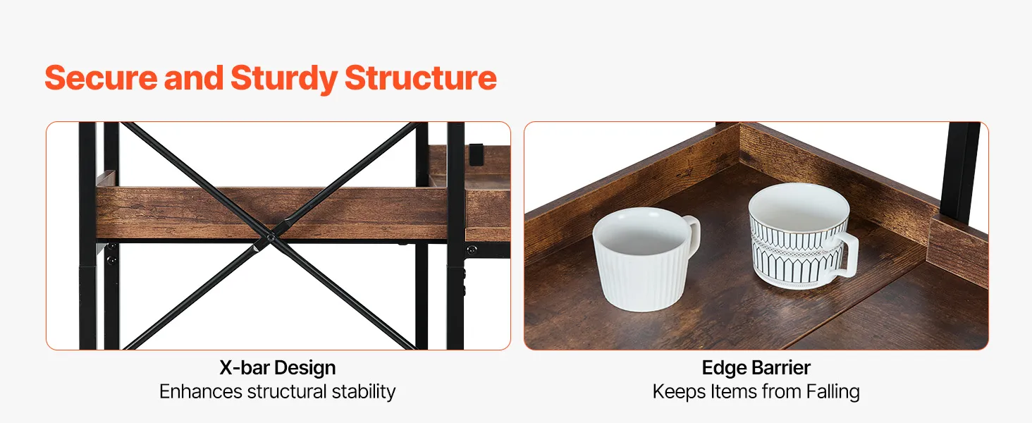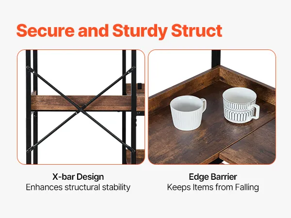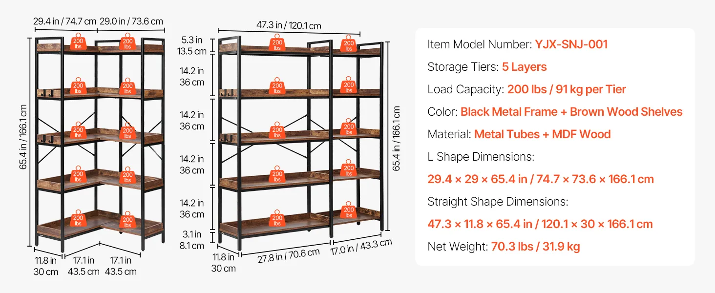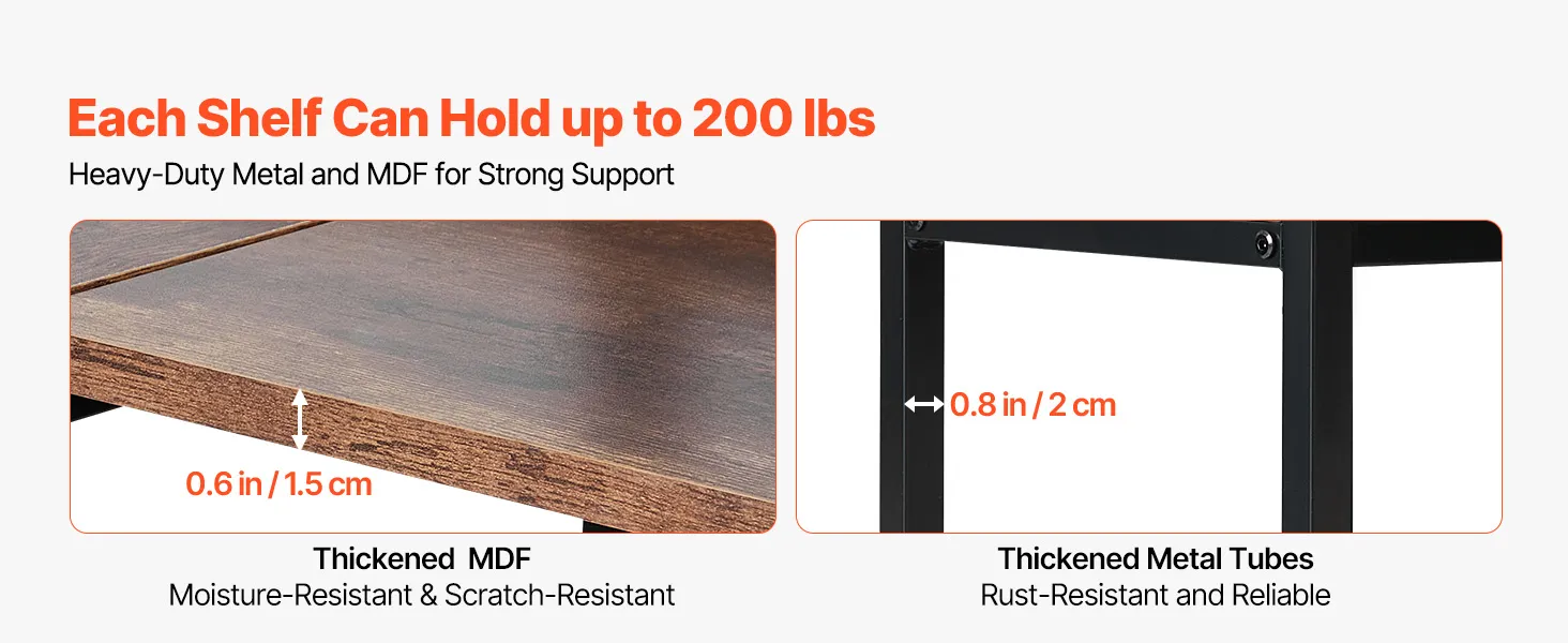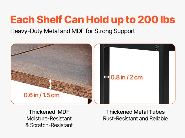 Wysokiej jakości materiały: Wykonane z trwałej płyty MDF i solidnego metalu, wzmocnione półki mają grubość 1,5 cm (0,6 cala), a metalowa rama ma grubość 2 cm (0,8 cala). Dzięki temu każda półka wytrzymuje obciążenie do 91 kg (200 funtów). Materiał jest odporny na zarysowania, zużycie i wilgoć, co zapewnia długotrwałą stabilność i trwałość bez odkształceń.