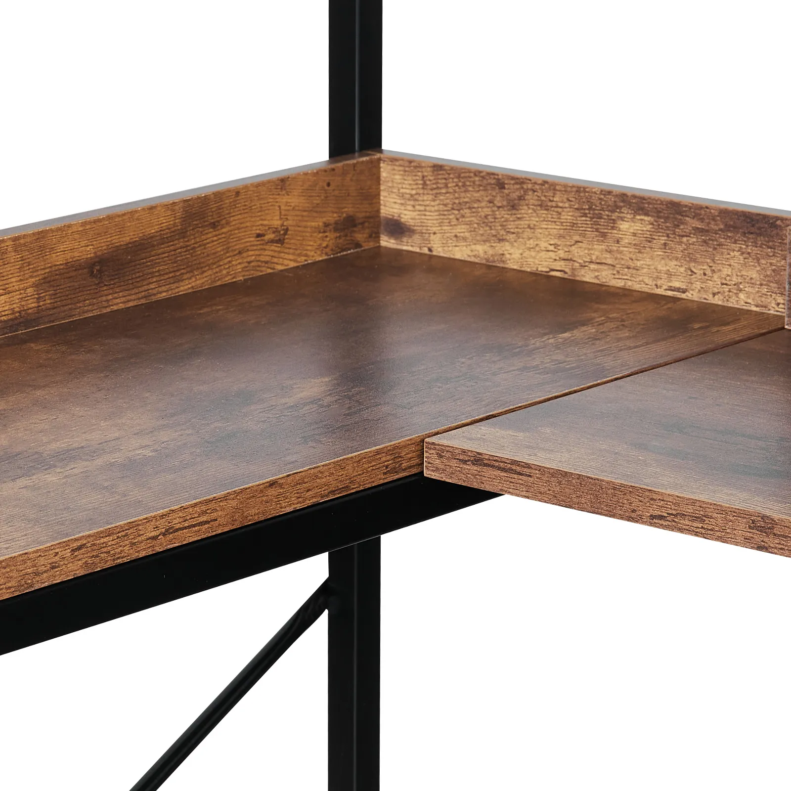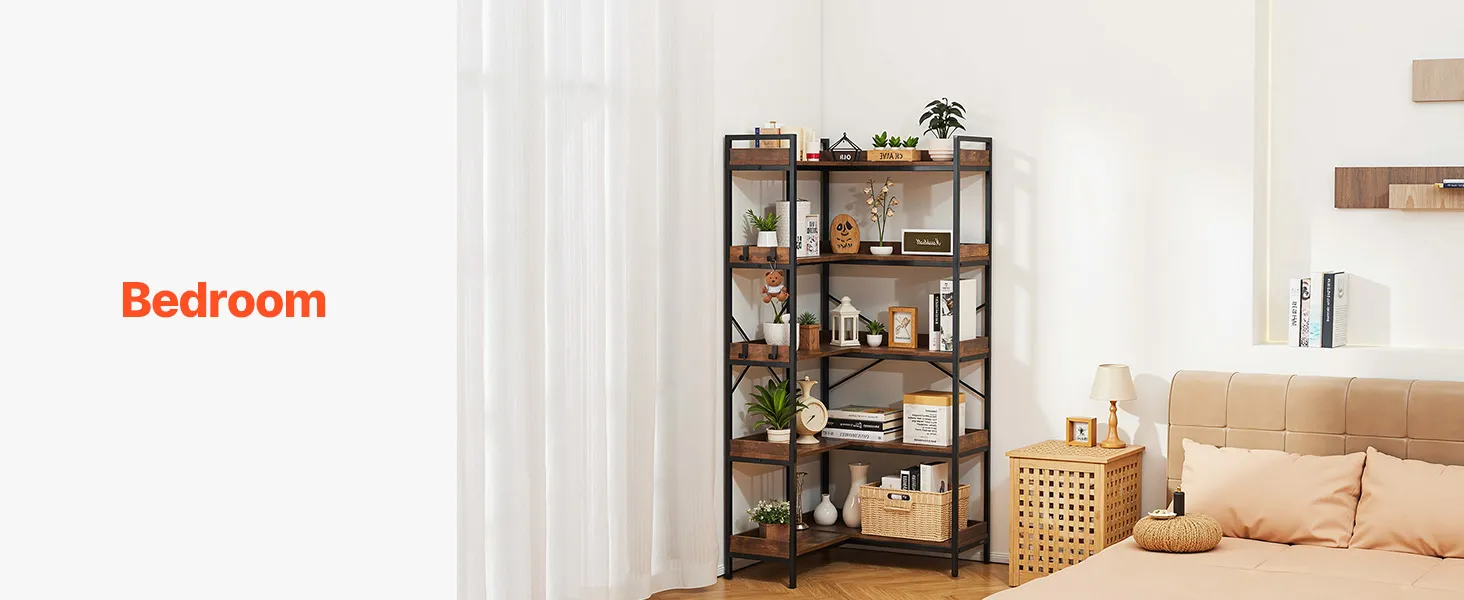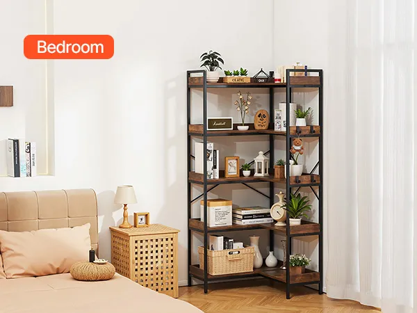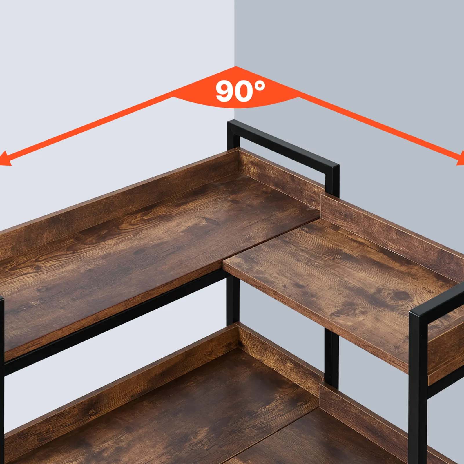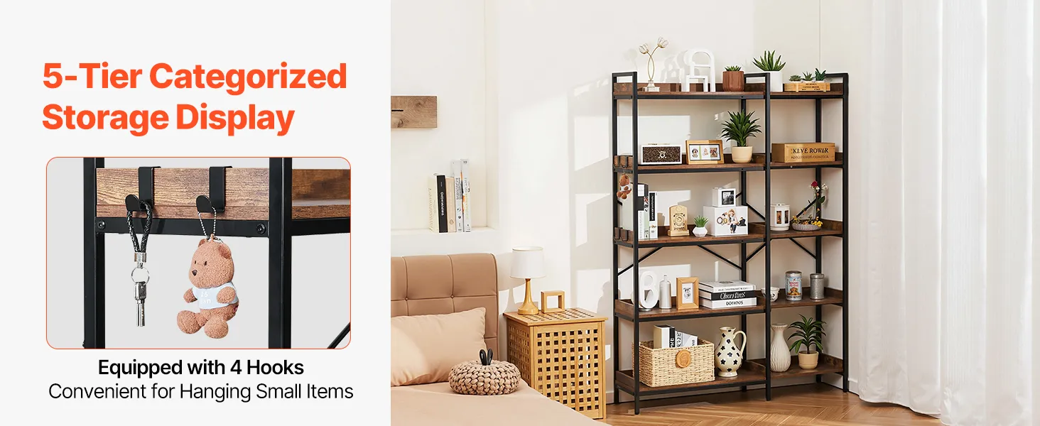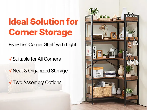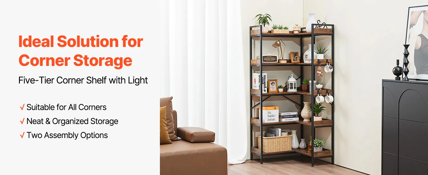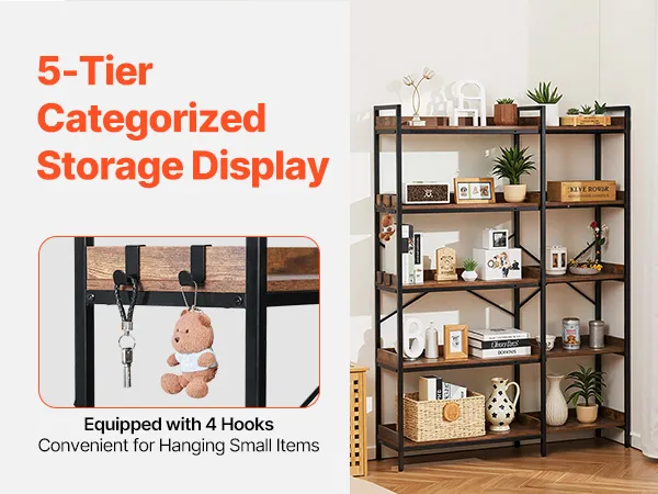 Półka narożna VEVOR 5-poziomowa, wysoka półka narożna z 4 haczykami, regał ekspozycyjny z metalową ramą i drewnianymi półkami, regał wystawowy do sypialni, salonu, biura, brązowy