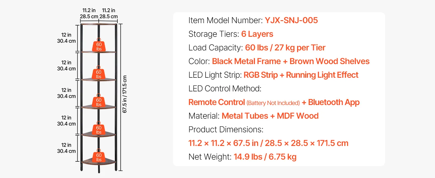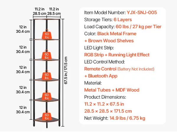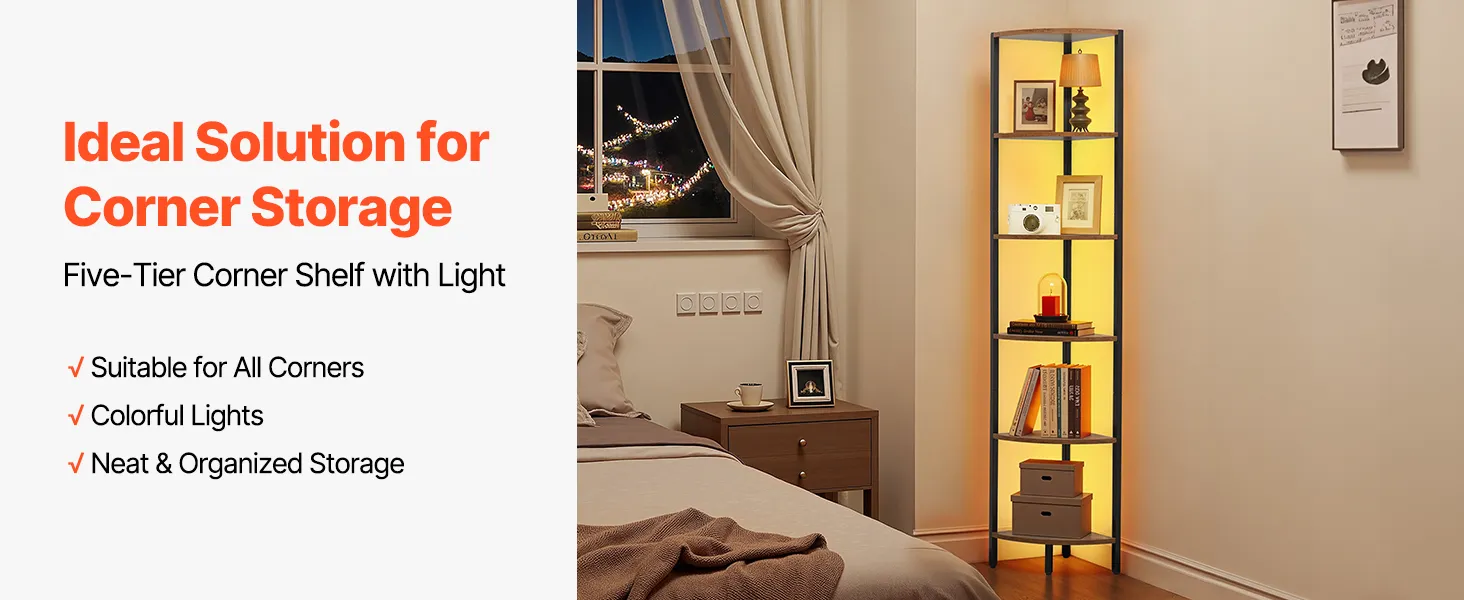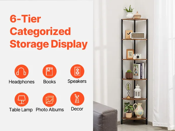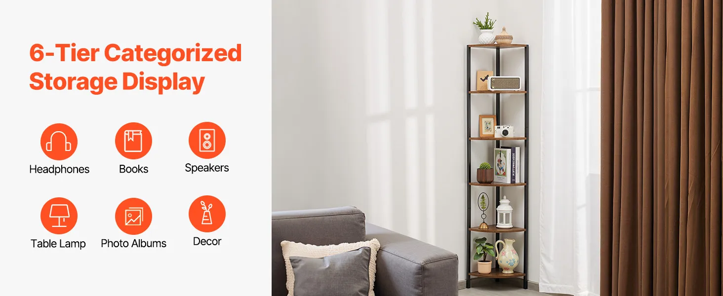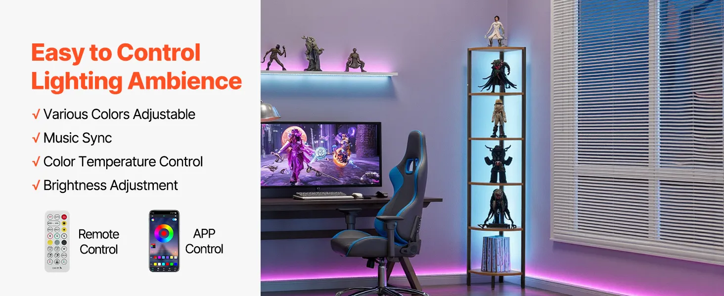Półka narożna VEVOR 6-poziomowa, wysoka półka narożna z oświetleniem LED, regał ekspozycyjny z metalową ramą i drewnianymi półkami, regał wystawowy do sypialni, salonu, biura, brązowy