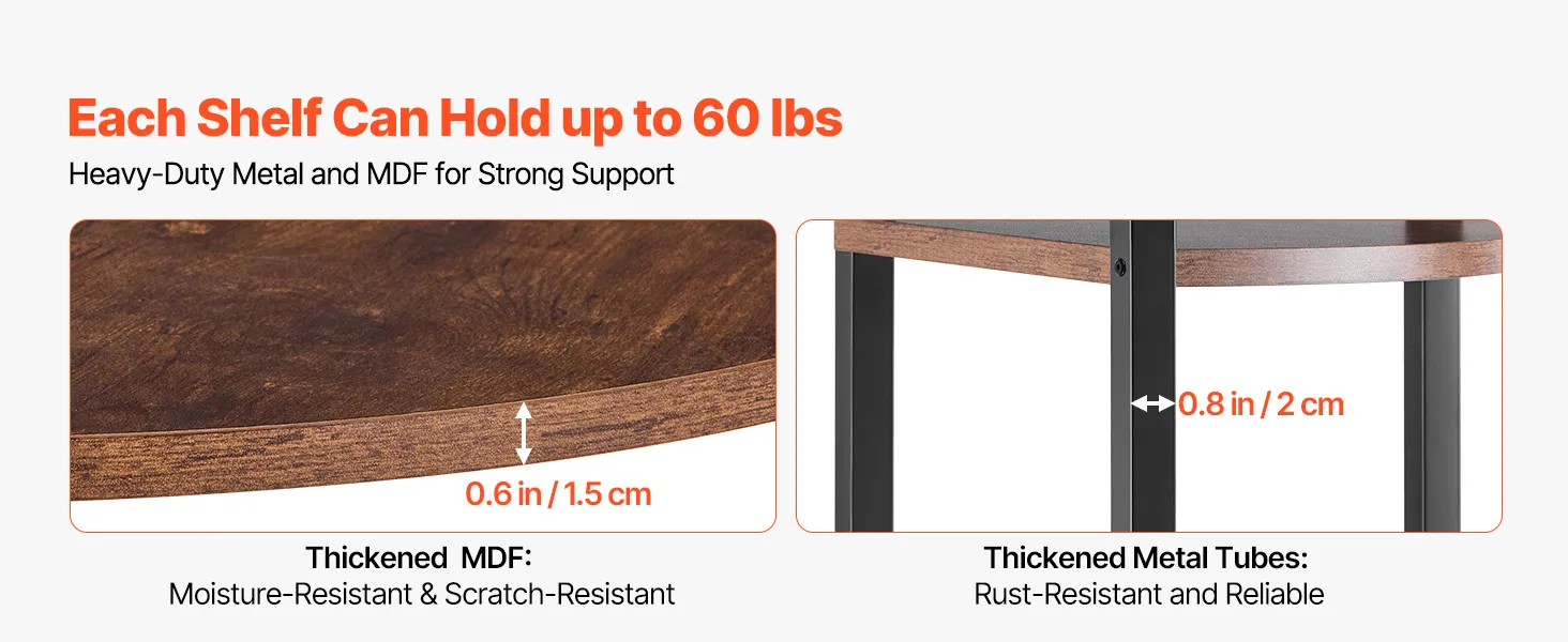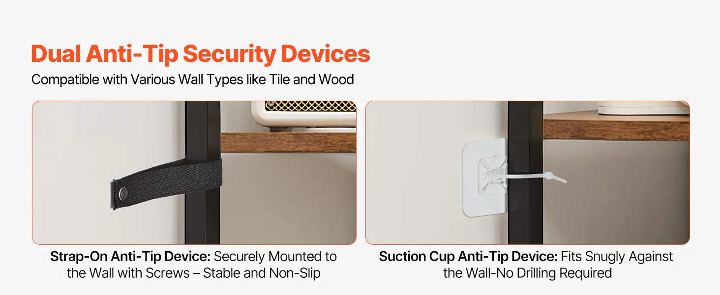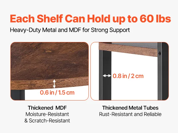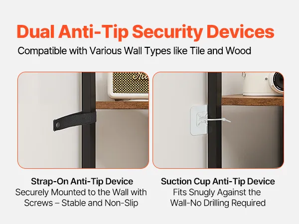 Solidna konstrukcja: Wykonana z trwałej płyty MDF i solidnego metalu, każda półka wytrzymuje obciążenie do 27 kg (60 funtów), zapewniając długotrwałą stabilność i trwałość bez odkształcania. Regulowane nóżki gwarantują stabilność na nierównych podłogach. Dwa dołączone zabezpieczenia przed przewróceniem są kompatybilne z różnymi rodzajami ścian, takimi jak płytki, drewno czy cement. Przed użyciem należy zamontować zabezpieczenia przed przewróceniem.