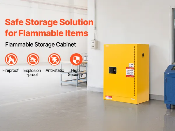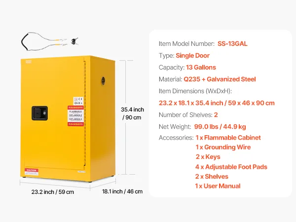 Nasza 13-galonowa szafa, wykonana z walcowanej na zimno stali Q235, ze spawaną obudową, jest trwała i odporna na korozję i odkształcenia. Wyposażona jest w otwory wentylacyjne, tackę ociekową oraz przewód uziemiający, chroniący przed wybuchami i elektrycznością statyczną. Nadaje się do przechowywania różnych materiałów łatwopalnych w warsztatach, fabrykach i garażach.