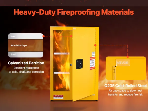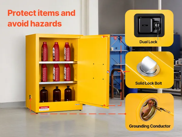 Ta łatwopalna szafka posiada wewnętrzne i zewnętrzne otwory wentylacyjne zapewniające cyrkulację powietrza, przewód uziemiający zapobiegający gromadzeniu się ładunków elektrostatycznych oraz szczelną tacę dolną. Trzypunktowy zamek dodatkowo zwiększa bezpieczeństwo przechowywanych materiałów.