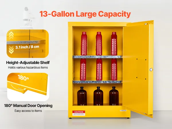 Przestronna i regulowana przestrzeń do przechowywania: Ta szafka na płyny łatwopalne oferuje imponującą pojemność 13 galonów (49,21 l) i dwie półki o regulowanej wysokości. Z łatwością pomieści płyny łatwopalne, takie jak alkohol, klej, rozcieńczalnik do lakierów czy benzyna. Sprawnie uporządkuj i zabezpiecz swoje materiały w jednym, bezpiecznym pojemniku.