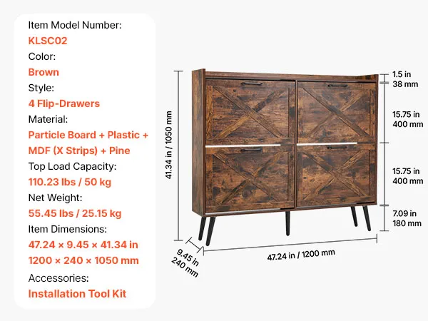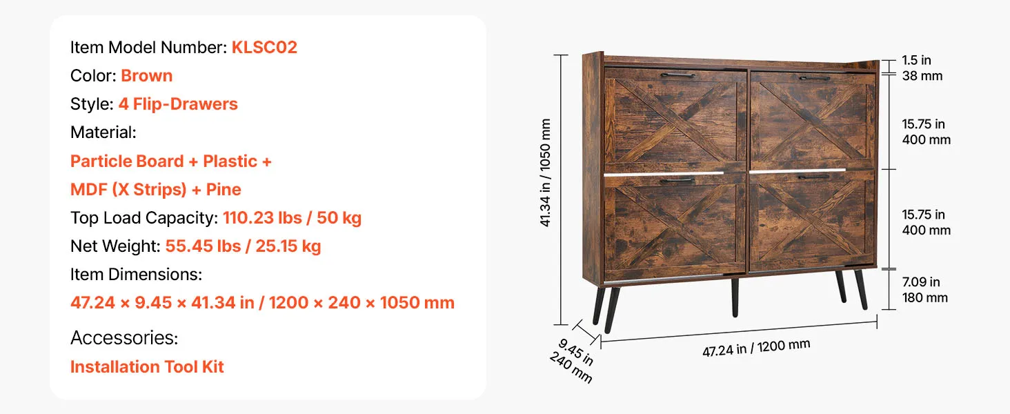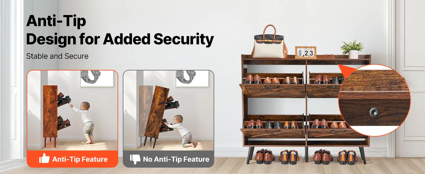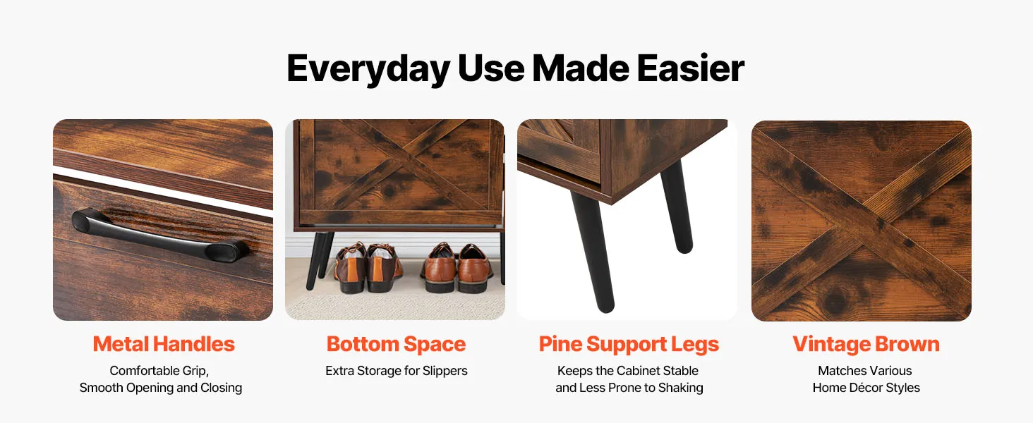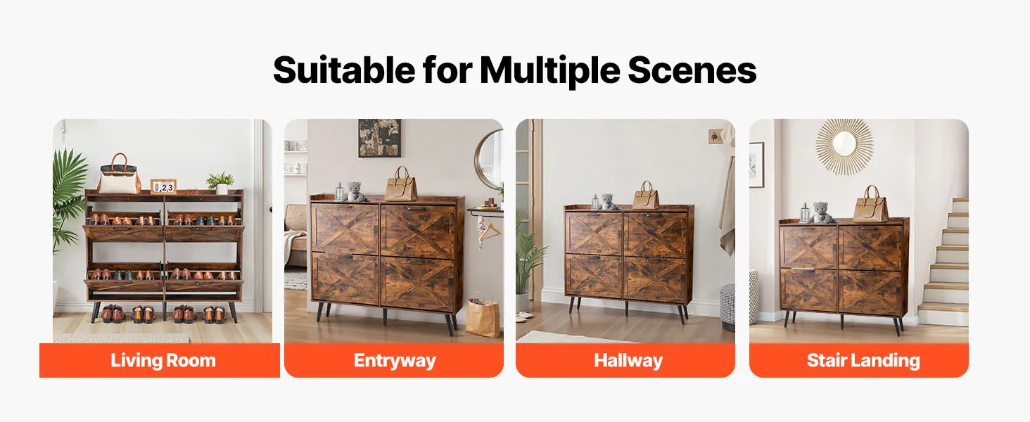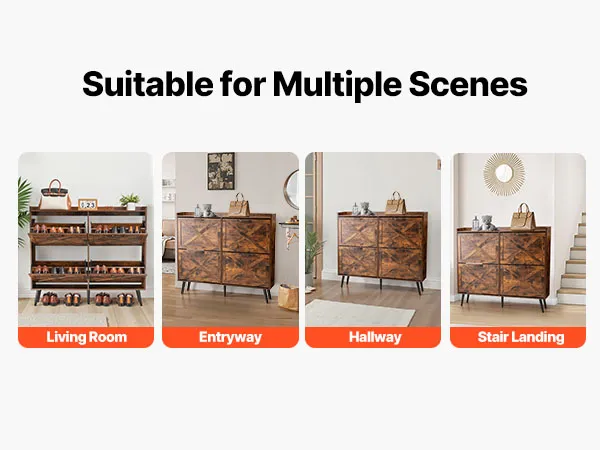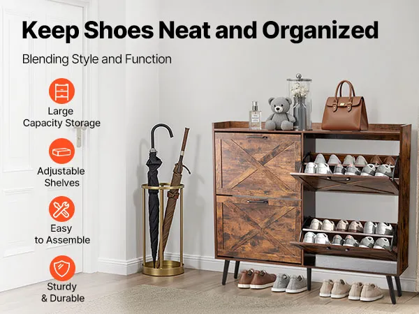 Szafka na buty VEVOR z 4 drzwiami i zabezpieczeniem przed przewróceniem, oszczędzająca miejsce wywrotka na buty, wolnostojący organizer na buty do przedpokoju, korytarza, salonu i werandy, vintage'owy stojak na buty 120 x 24 x 105 cm, brązowy