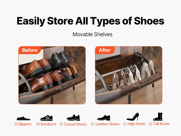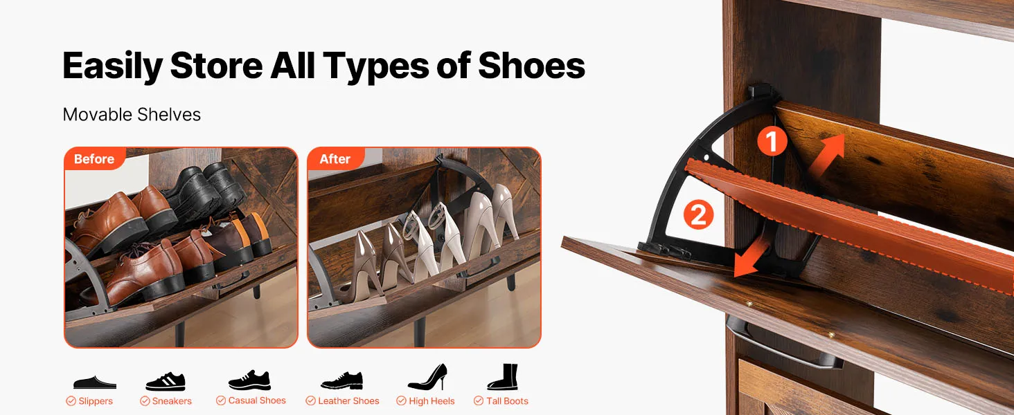 Przenośne półki pomieszczą buty o różnych rozmiarach i wysokościach — od kapci i trampek po buty na obcasie i wysokie buty — zapewniając uporządkowane przechowywanie butów całej rodziny.