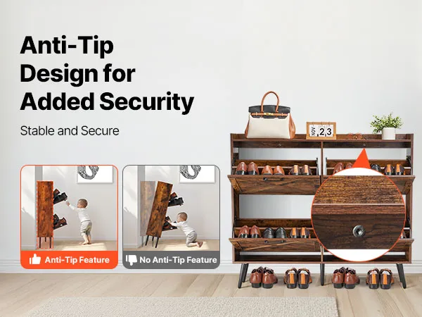 Stabilna i wytrzymała: Zabezpieczenie przed przewróceniem mocuje szafkę na buty do ściany, zmniejszając ryzyko przewrócenia. Wykonana z płyty wiórowej dla zapewnienia stabilności i trwałości. Powierzchnia wytrzymuje obciążenie do 50 kg i nadaje się do przechowywania dekoracji lub koszy.