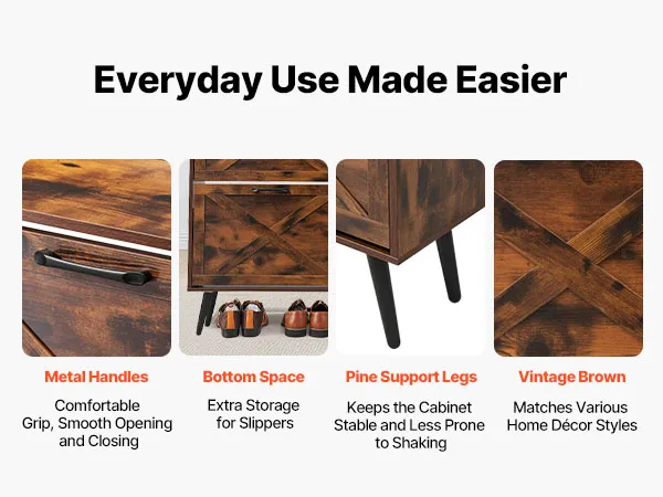 Brązowe wykończenie w stylu vintage z metalowymi uchwytami; nóżki z drewna sosnowego zapewniają stabilność. Dolna komora pomieści codzienne obuwie, przeznaczone do codziennego użytku.