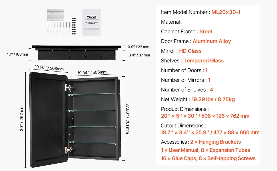 Pasuje do różnych rozmiarów: Wymiary całkowite (dł. x gł. x wys.): 508 x 126 x 762 mm (20 x 5 x 30 cali); Wymiary montażowe (dł. x gł. x wys.): 18,7 x 3,4 x 25,9 cala. Wyposażona w lustro o wysokiej rozdzielczości, ta szafka na leki ze ściętymi krawędziami sprawia, że pomieszczenie wydaje się bardziej otwarte i jasne.