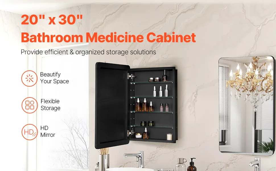Szafka na leki VEVOR z lustrem (508 x 126 x 762 mm) do łazienki z drzwiami lustrzanymi i regulowanymi szklanymi półkami, wbudowana i montowana na ścianie, aluminiowa rama, szafka łazienkowa z lustrem