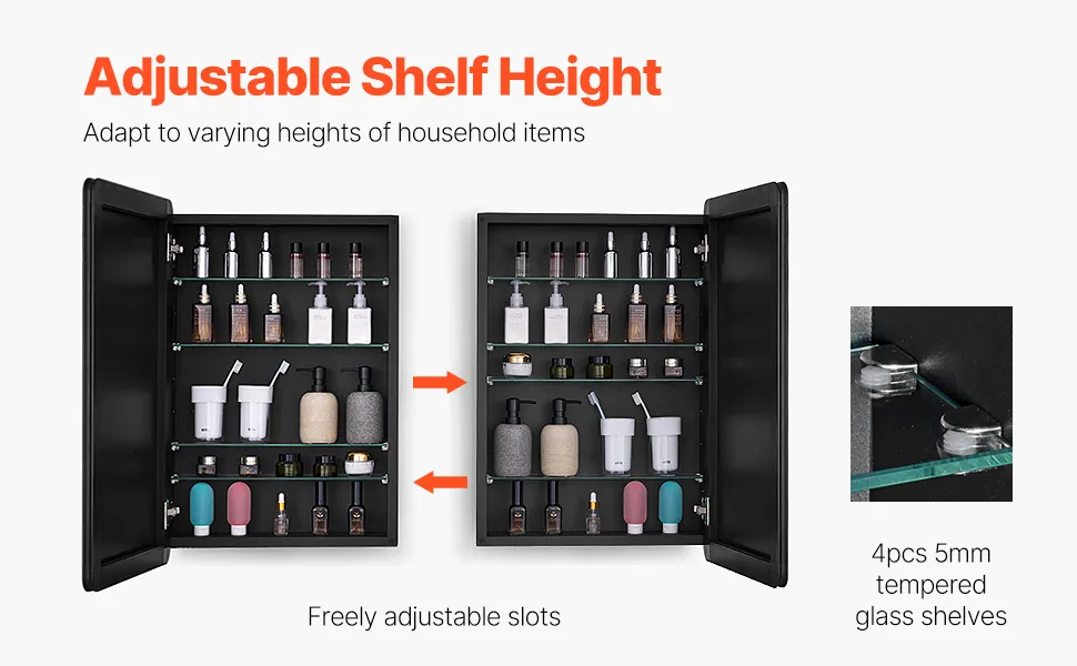 Dużo miejsca do przechowywania: Regulowane, czterowarstwowe szkło hartowane o grubości 5 mm zapewnia jeszcze więcej miejsca do przechowywania, z regulowanymi przegródkami na półkach. Lustrzana szafka na leki oferuje wszechstronne miejsce do przechowywania wszystkiego, od małych butelek z lekami po duże pojemniki na szampon i kosmetyki, gwarantując, że żadna przestrzeń nie pozostanie niewykorzystana.
