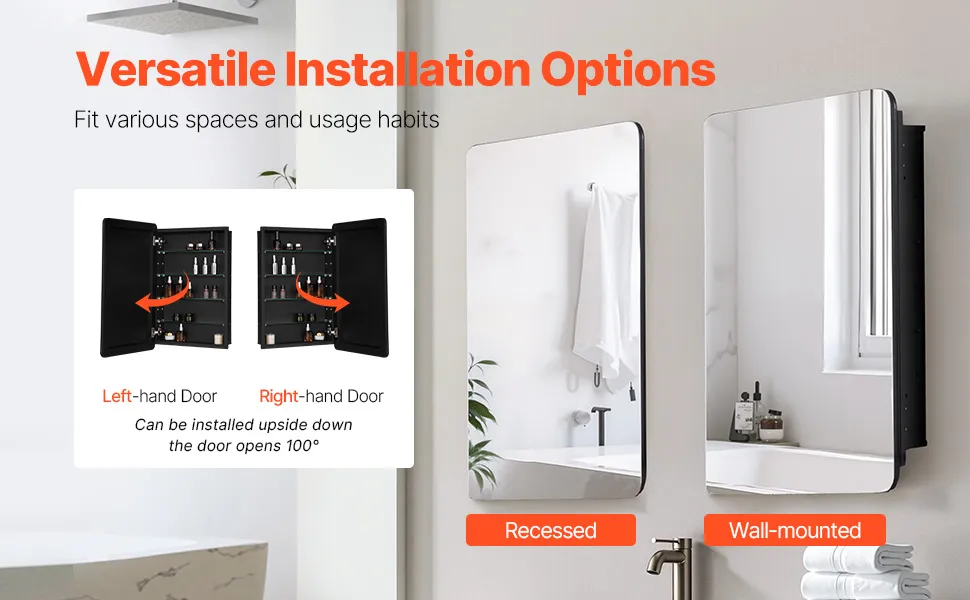 Montaż na ścianie lub w zabudowie: Szafka łazienkowa z lustrem oferuje dwie metody montażu – montaż na ścianie lub w zabudowie – i obsługuje montaż do góry nogami, co pozwala na zmianę kierunku otwierania drzwi. Wybierz najodpowiedniejszą opcję w oparciu o układ łazienki i osobiste preferencje, aby maksymalnie wykorzystać przestrzeń.