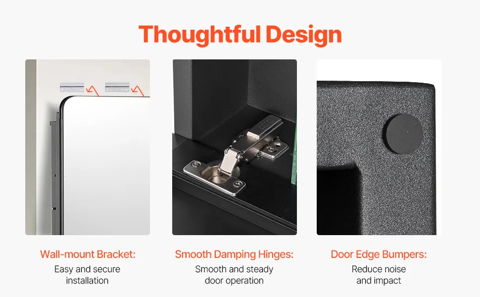 Dodatkowe funkcje premium: Wyposażona w wysokiej jakości, ciche zawiasy tłumiące, ta szafka na leki z lustrem została zaprojektowana z myślą o płynnym i cichym otwieraniu i zamykaniu. Powierzchnia jest odporna na zarysowania i rdzę, a dołączone poduszki dodatkowo redukują hałas, co poprawia komfort użytkowania.