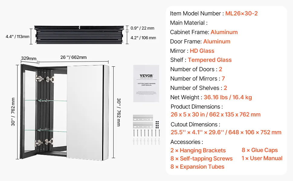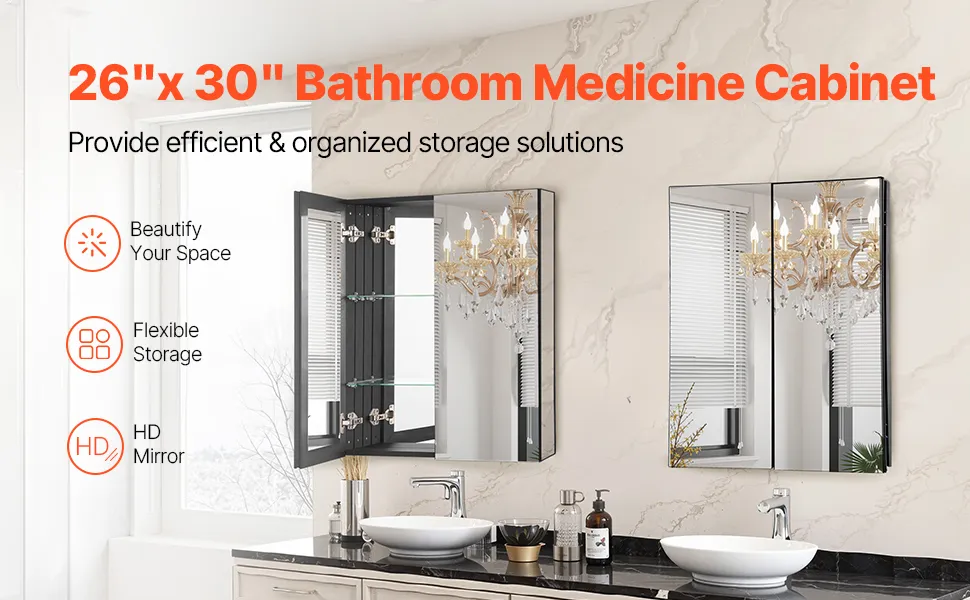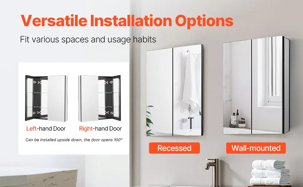 Pasuje do różnych rozmiarów: Wymiary całkowite (dł. x gł. x wys.): 26 x 5 x 30 cali (662 x 135 x 762 mm); Wymiary do montażu wpuszczanego (dł. x gł. x wys.): 39,6 x 4,1 x 22,7 cala. Konstrukcja lusterek wewnętrznych i zewnętrznych zapewnia harmonijny wygląd i oferuje wiele kątów odbicia, dzięki czemu możesz wygodnie sprawdzić swój wygląd z każdej strony